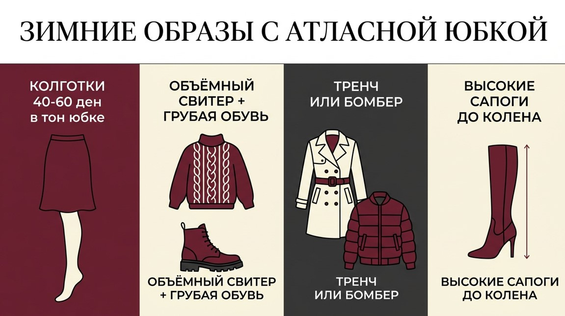 Зимой атласная юбка носится поверх плотных колготок от 40 до 60 ден в тон юбке или нейтрального оттенка — это главный технический приём. Верх — объёмный свитер или кардиган плюс ботинки на грубой подошве или ботильоны. Контраст тяжёлого трикотажа и скользящего атласа — один из самых выразительных сезонных образов.