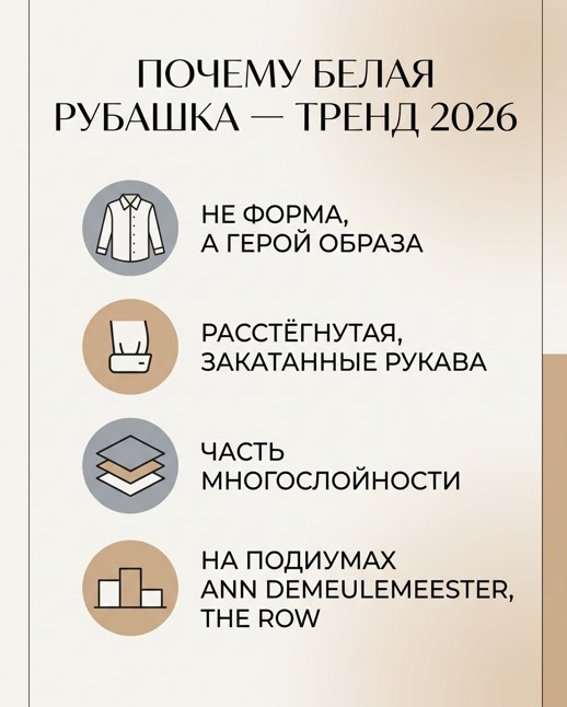 В 2026 году белая рубашка вышла из категории «деловая база» и заняла место акцентной вещи. Подиумы весна-лето 2026 (включая Ann Demeulemeester (Анн Демёлемёстер), Tod's (Тодс), The Row (Зе Роу)) показали её не как фон, а как смысловой центр образа — с подвёрнутыми манжетами, частичной заправкой и контрастной нижней парой.