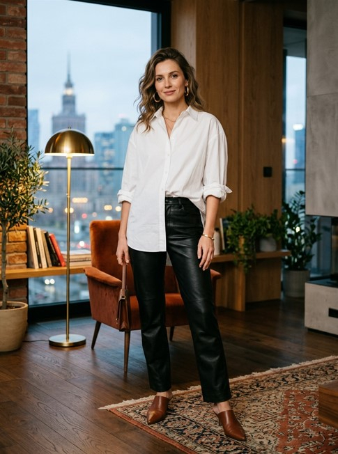 Контраст матовой кожи и хрустящего белого хлопка — один из самых эффектных приёмов сезона. Кожа делает образ «дорогим», а белая рубашка снимает с него агрессию — получается баланс между женственностью и силой.