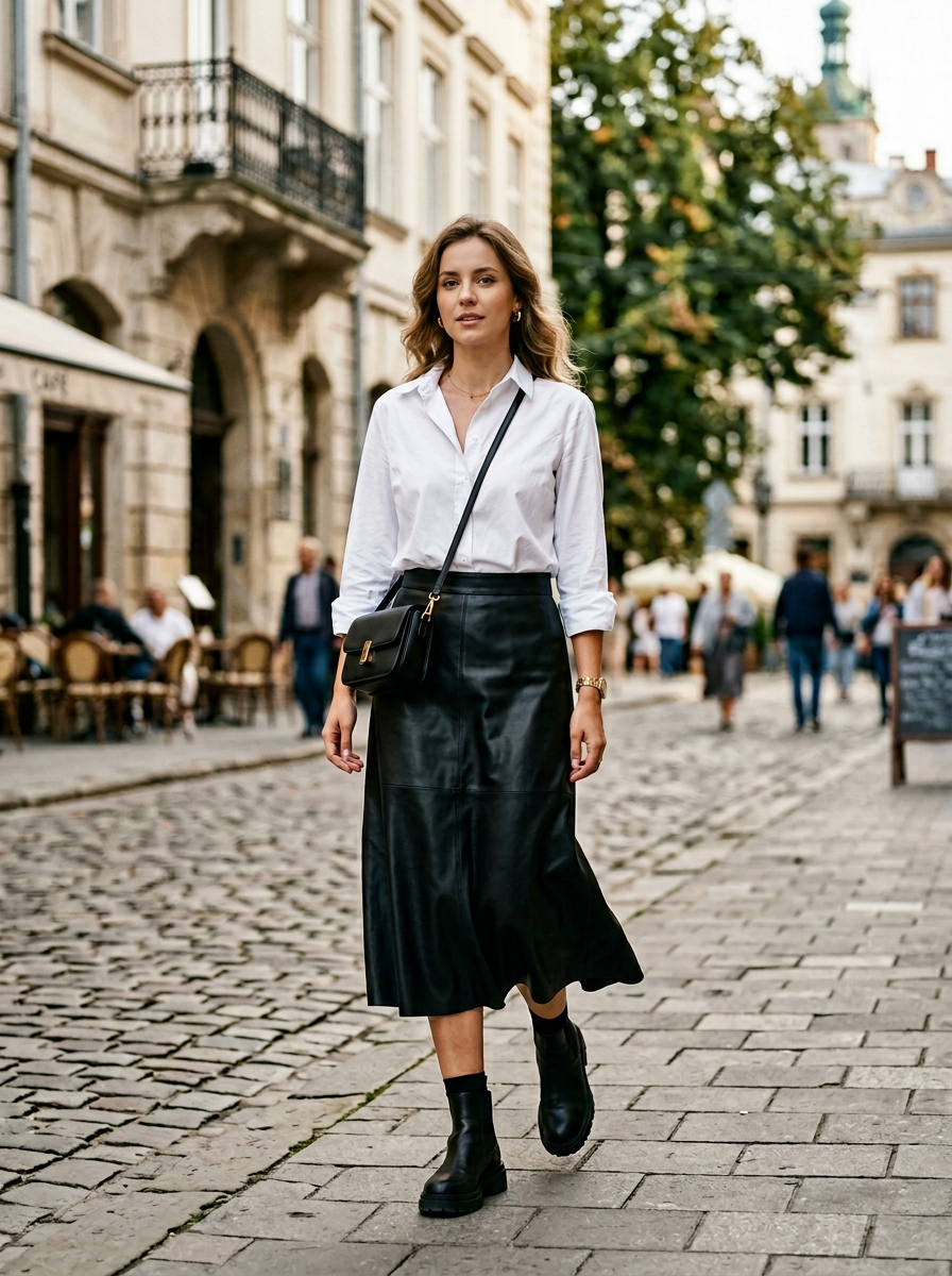 - С чёрной кожаной юбкой-миди — вечерний городской образ.