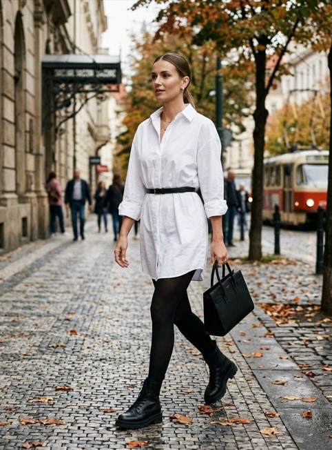 Платье-рубашка — гибрид, который снимает вопрос «верх + низ». Носите его с тонким ремнём (создаст талию), грубыми сандалиями или белыми кроссовками. На прохладные дни — поверх тонких чёрных колготок с ботильонами и кардиганом.