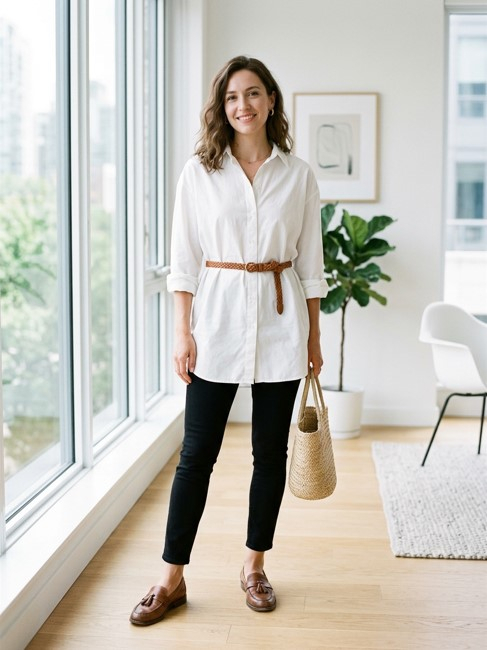 - Отказ от аксессуаров «чтобы было строго». Без ремня, серёг или платка белая рубашка выглядит плоско. Один акцент обязателен.
