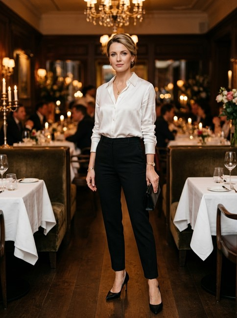 Шёлковая белая рубашка — вечерняя и нарядная вещь. Её фактура «перетягивает» образ в сторону роскоши, поэтому партнёр по образу должен быть либо очень простым (и тогда рубашка солирует), либо того же уровня сложности.