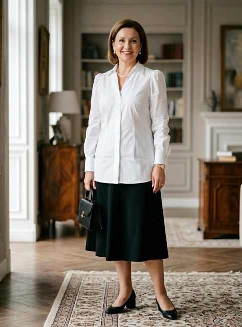 Для женщин 35–60 лет это хорошая новость: правила стилизации стали мягче. Если раньше белая рубашка означала строгий силуэт + чёрные брюки + лодочки, то теперь допустимо сочетать её с трикотажными брюками, грубыми ботинками, юбкой-миди из кожи или кружевной макси. Главное — не «идеальная посадка», а правильный контекст.