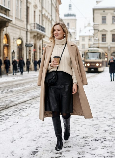 Главная ошибка с кожаной миди — слишком объёмный низ в сочетании со свободным верхом: силуэт теряет форму. Если юбка широкая трапеция — верх должен быть облегающим, и наоборот.