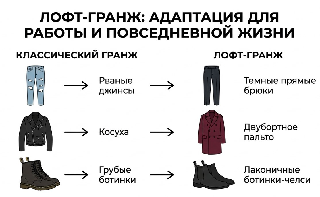 Подстиль лофт-гранж позволяет интегрировать элементы направления в офисный гардероб. Принцип адаптации: заменить рваные джинсы на темные прямые брюки, косуху - на двубортное пальто прямого кроя, грубые ботинки - на ботильоны с массивной, но аккуратной подошвой. Ткани - натуральные: хлопок, лен, замша, кожа. Цвета - бордовый, коричневый, бежевый, оливковый. Лофт-гранж сохраняет ключевой принцип направления - свободный силуэт и комфорт, но убирает нарочитую «разрушенность» вещей. Это делает его приемлемым для офисов с умеренным дресс-кодом.