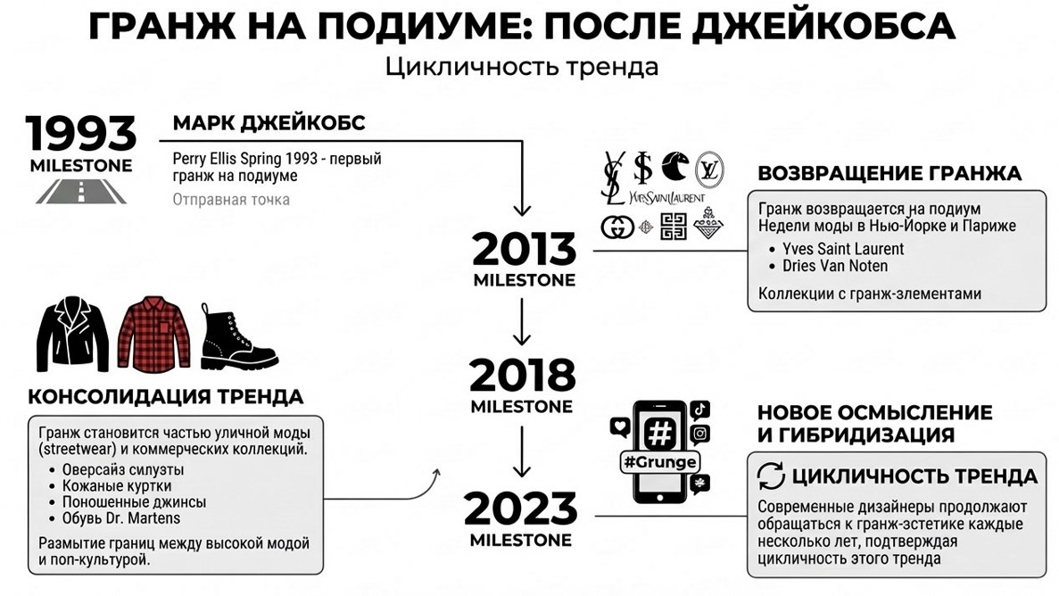 В 2013 году Yves Saint Laurent и Dries Van Noten вернули гранж на подиум, представив коллекции с гранж-элементами на Неделе моды в Нью-Йорке и Париже. В 2022 году журнал Nylon назвал гранж 1990-х «одним из главных модных трендов осени 2022», отметив коллекции Marc Jacobs, Molly Goddard, Dsquared2 и Givenchy. В 2025 году итальянский дом Magliano представил осенне-зимнюю коллекцию, вдохновленную гранж-модой, что зафиксировал журнал GQ. Современные дизайнеры продолжают обращаться к гранж-эстетике каждые несколько лет, подтверждая цикличность этого тренда.