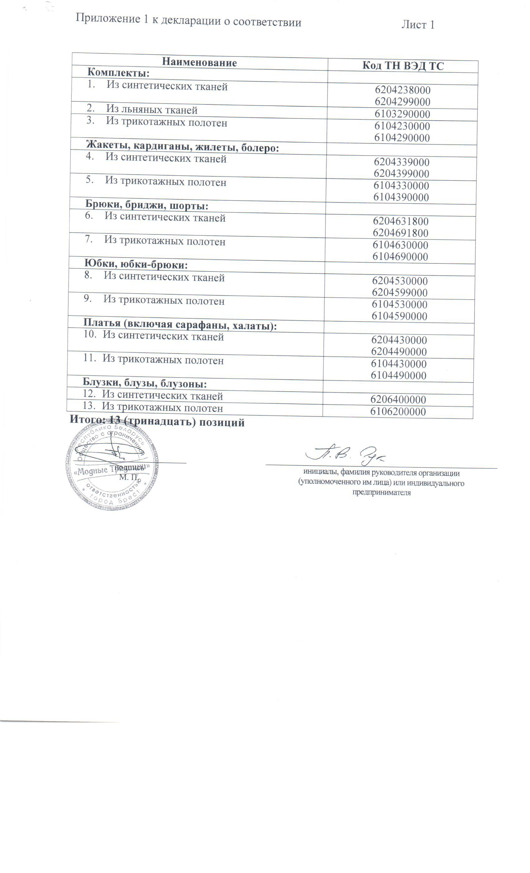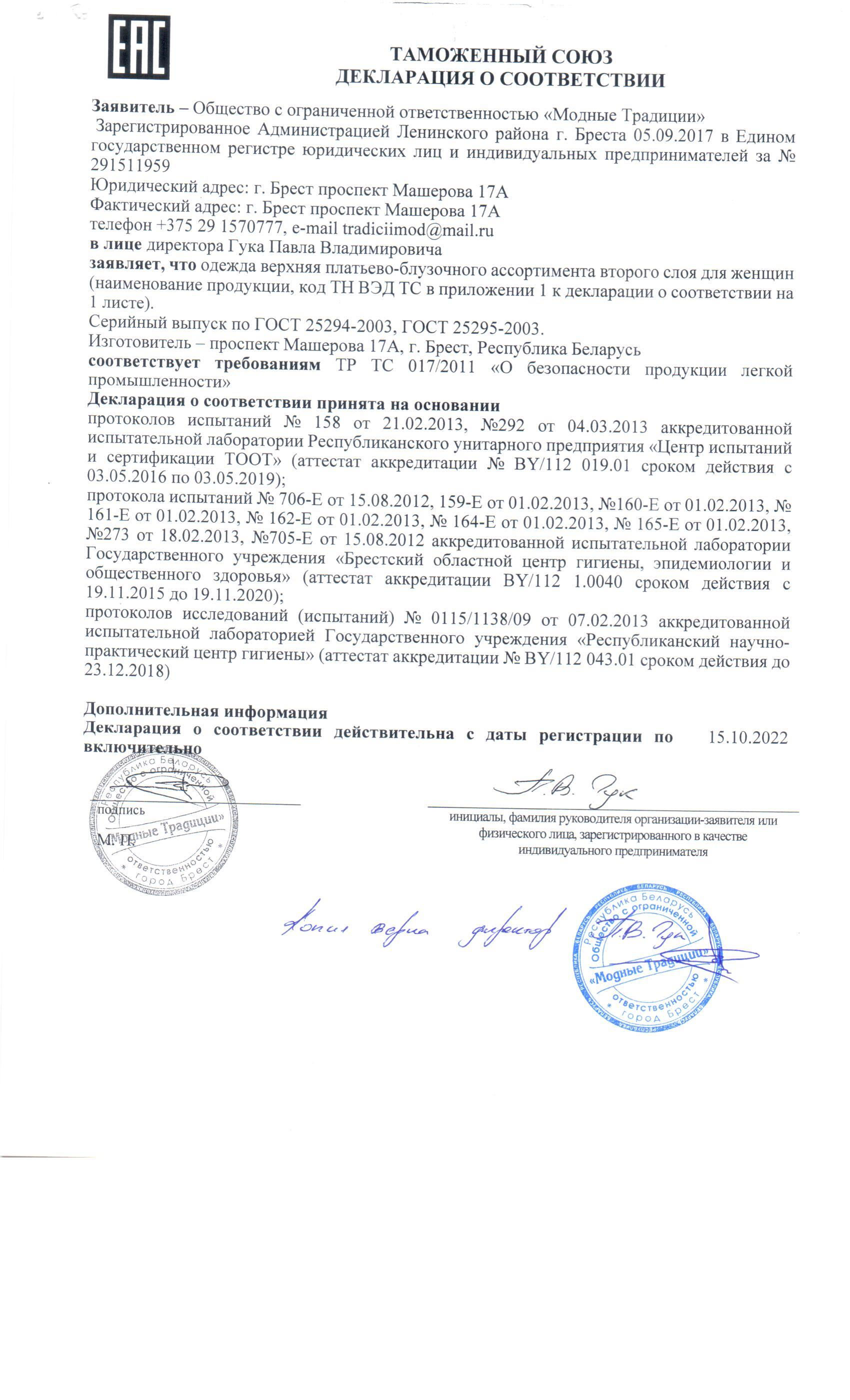 Качество одежды, представленной на сайте, подтверждено Декларацией соответствия Таможенного союза. Этот документ даёт право на реализацию товара на территории России, Беларуси, Казахстана, Армении, Киргизии без дополнительных проверок внутри страны. Наличие Декларации соответствия ТС делает процесс выхода товара на рынок максимально удобным и быстрым.