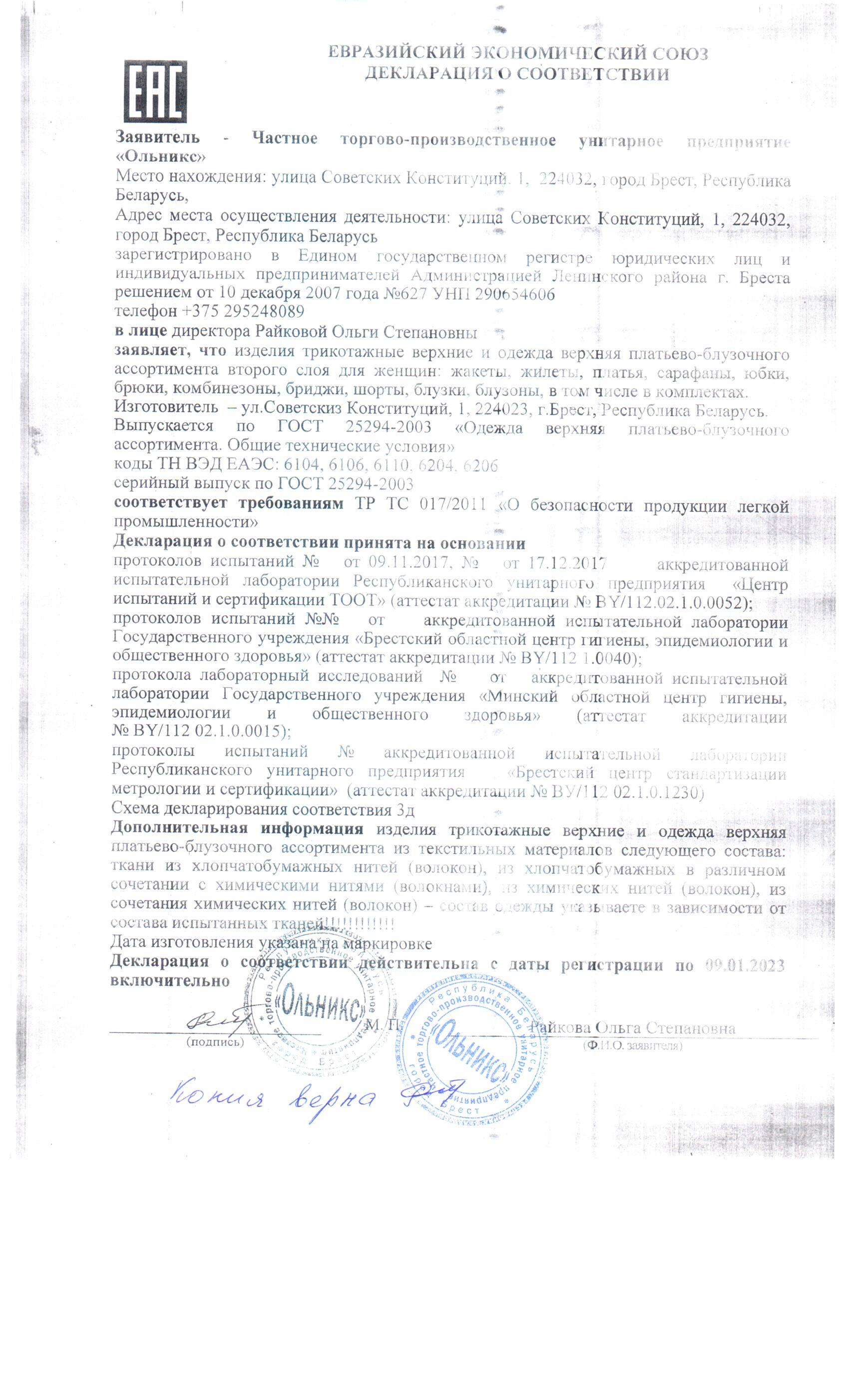 Качество одежды, представленной на сайте, подтверждено Декларацией соответствия Таможенного союза. Этот документ даёт право на реализацию товара на территории России, Беларуси, Казахстана, Армении, Киргизии без дополнительных проверок внутри страны. Наличие Декларации соответствия ТС делает процесс выхода товара на рынок максимально удобным и быстрым.