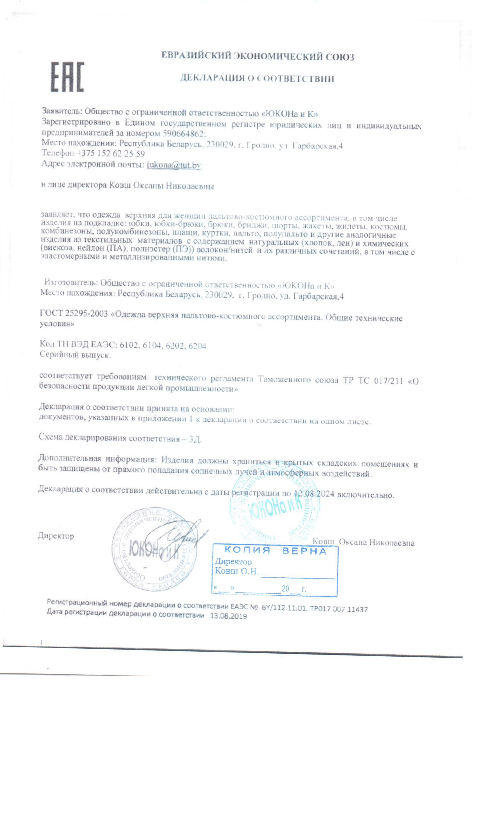 Качество одежды, представленной на сайте, подтверждено Декларацией соответствия Таможенного союза. Этот документ даёт право на реализацию товара на территории России, Беларуси, Казахстана, Армении, Киргизии без дополнительных проверок внутри страны. Наличие Декларации соответствия ТС делает процесс выхода товара на рынок максимально удобным и быстрым.