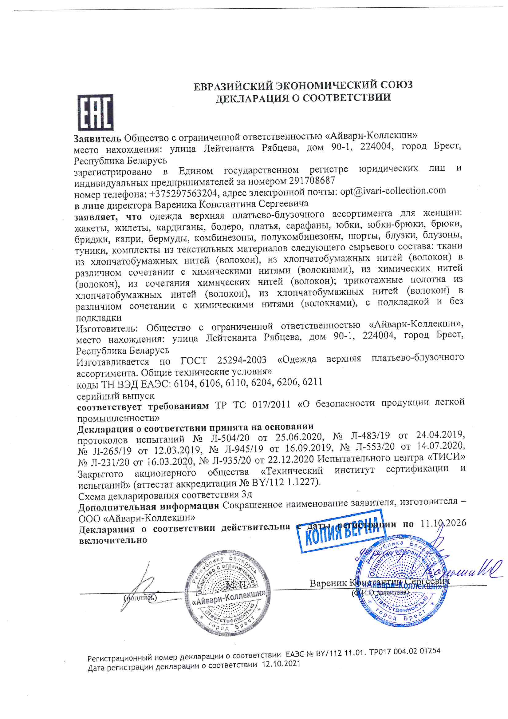 Каждой Декларации соответствия отведено место в специальном электронном реестре. По номеру декларации легко проверить правомерность и актуальность документа.
