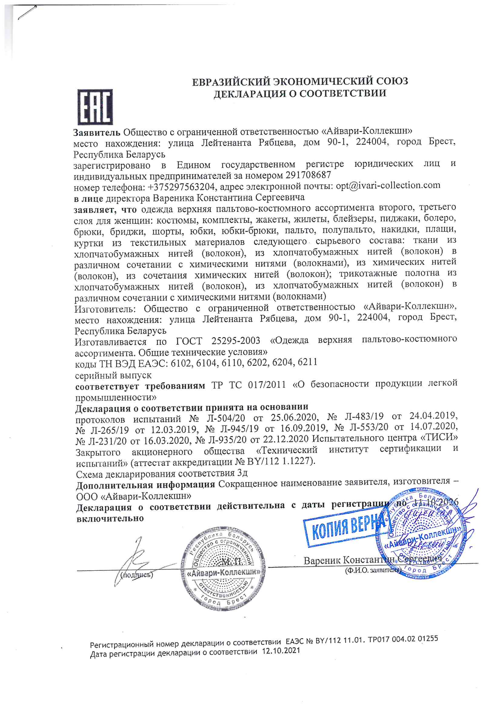 Качество одежды, представленной на сайте, подтверждено Декларацией соответствия Таможенного союза. Этот документ даёт право на реализацию товара на территории России, Беларуси, Казахстана, Армении, Киргизии без дополнительных проверок внутри страны. Наличие Декларации соответствия ТС делает процесс выхода товара на рынок максимально удобным и быстрым.