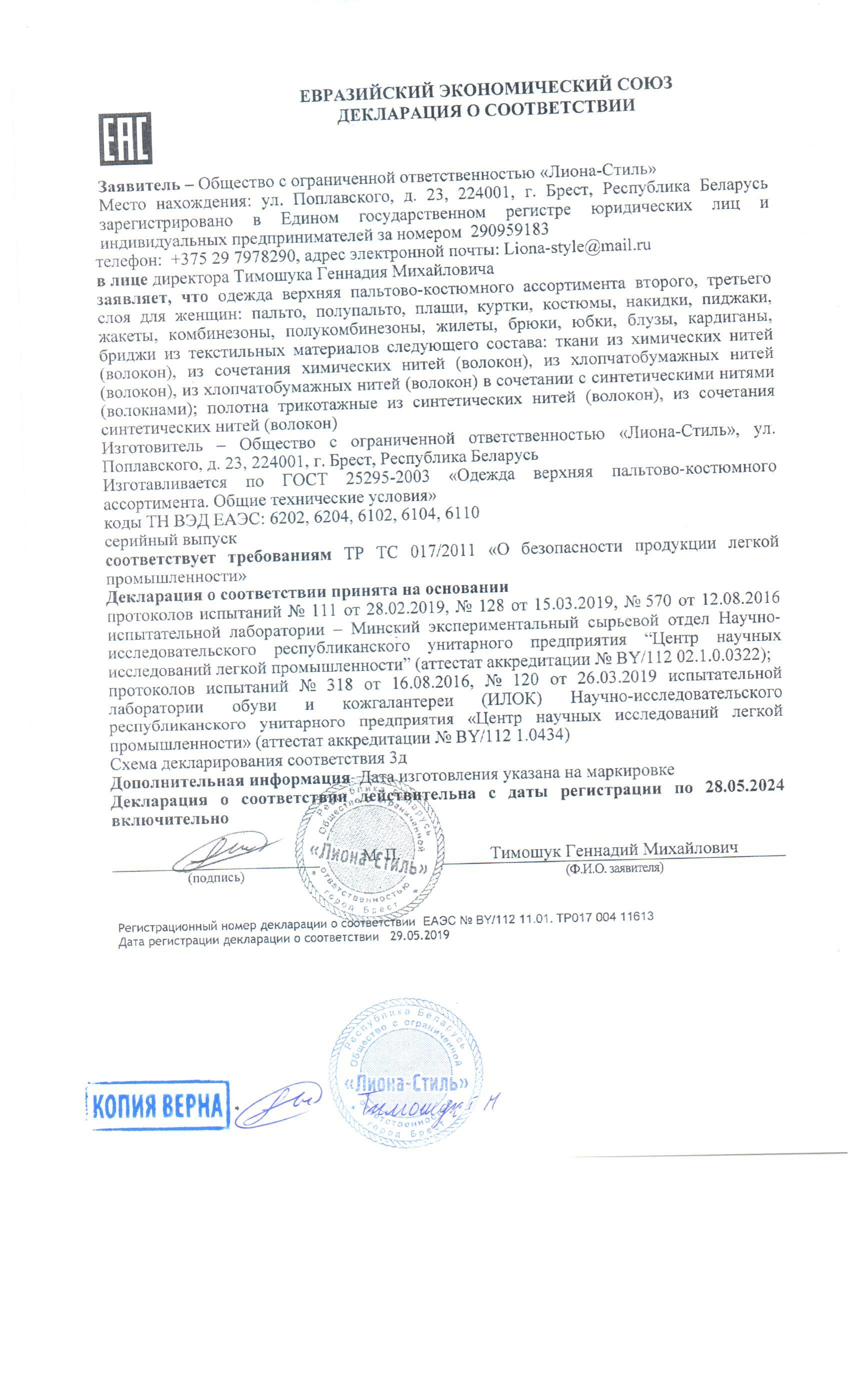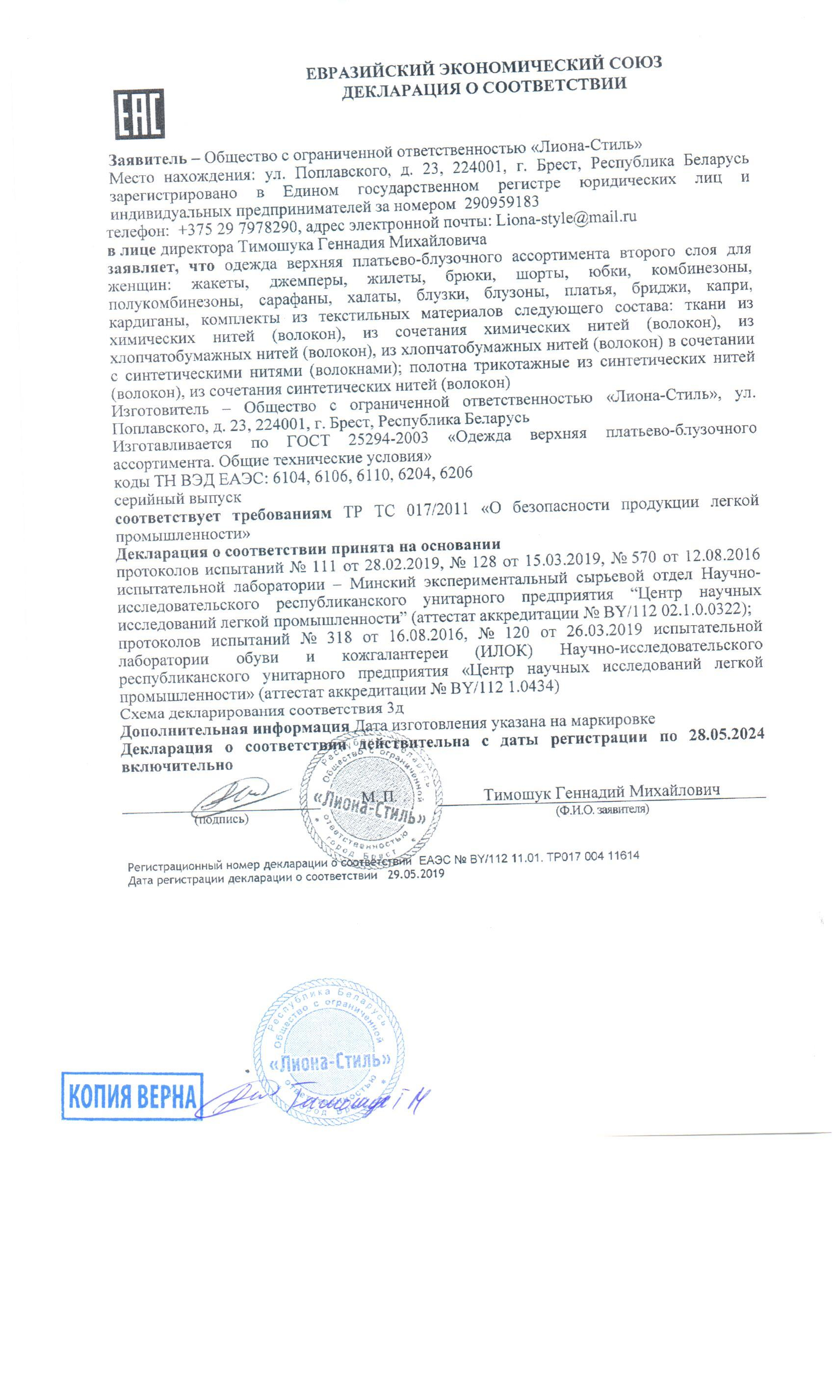 Качество одежды, представленной на сайте, подтверждено Декларацией соответствия Таможенного союза. Этот документ даёт право на реализацию товара на территории России, Беларуси, Казахстана, Армении, Киргизии без дополнительных проверок внутри страны. Наличие Декларации соответствия ТС делает процесс выхода товара на рынок максимально удобным и быстрым.