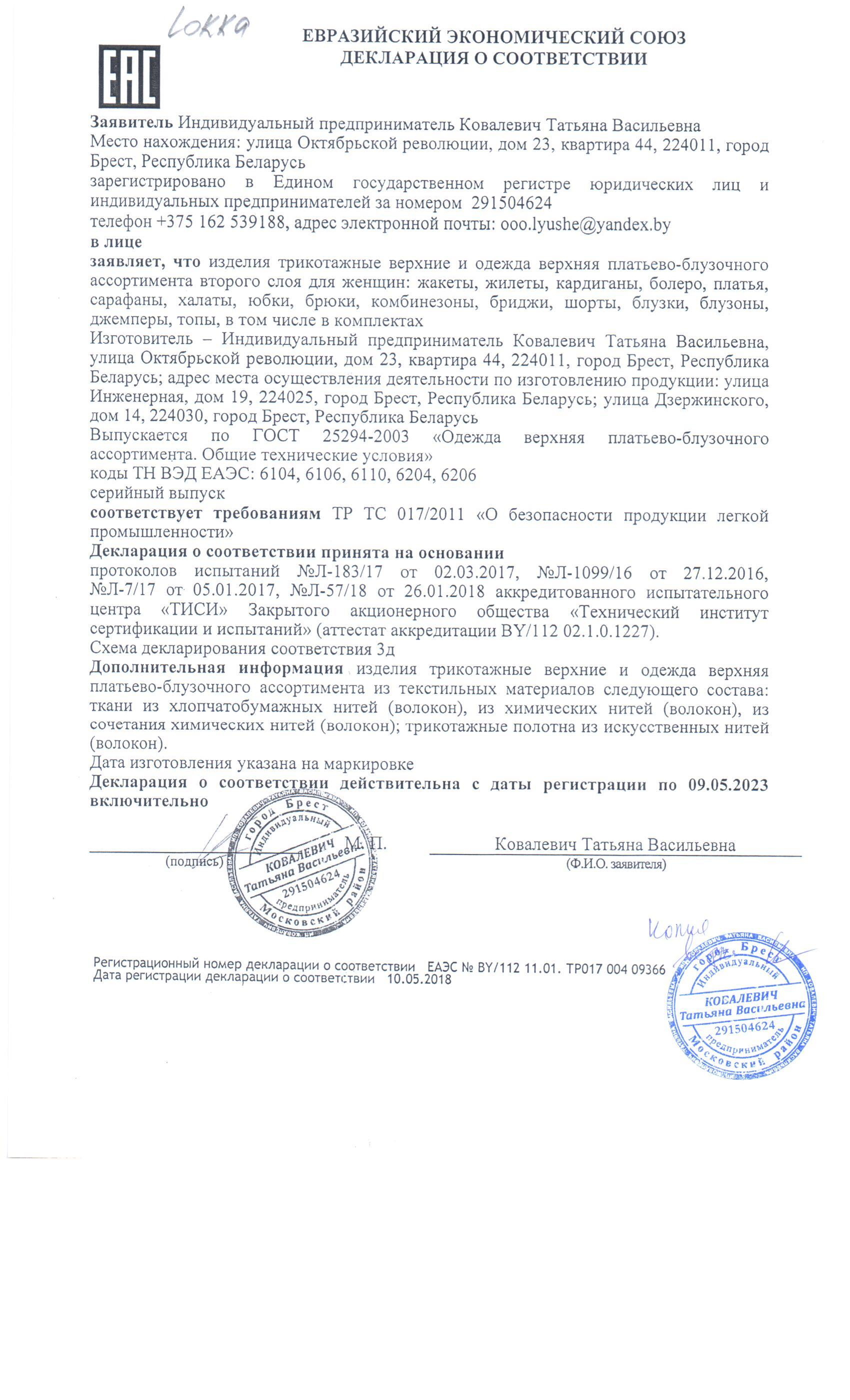 Качество одежды, представленной на сайте, подтверждено Декларацией соответствия Таможенного союза. Этот документ даёт право на реализацию товара на территории России, Беларуси, Казахстана, Армении, Киргизии без дополнительных проверок внутри страны. Наличие Декларации соответствия ТС делает процесс выхода товара на рынок максимально удобным и быстрым.