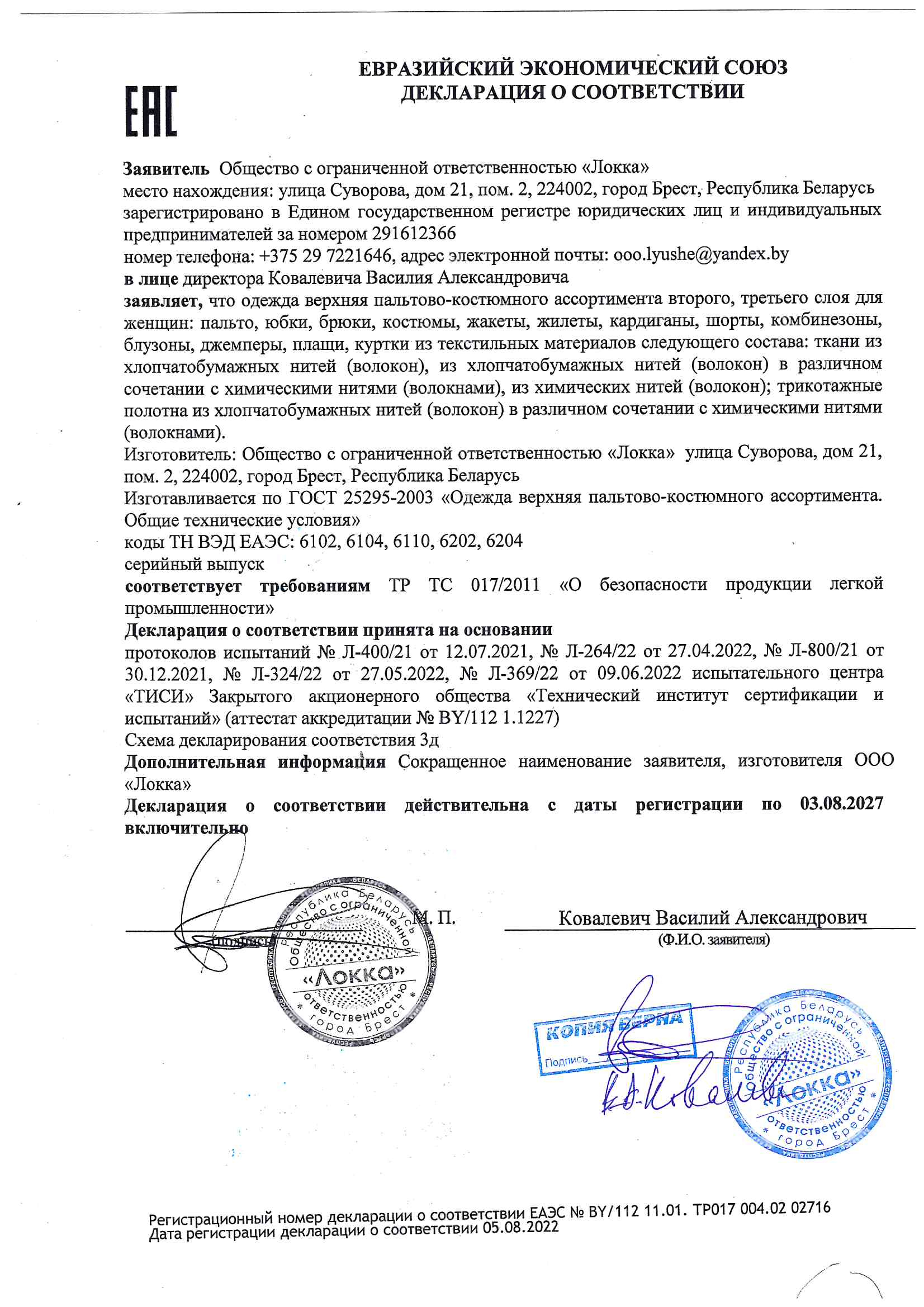 Каждой Декларации соответствия отведено место в специальном электронном реестре. По номеру декларации легко проверить правомерность и актуальность документа.