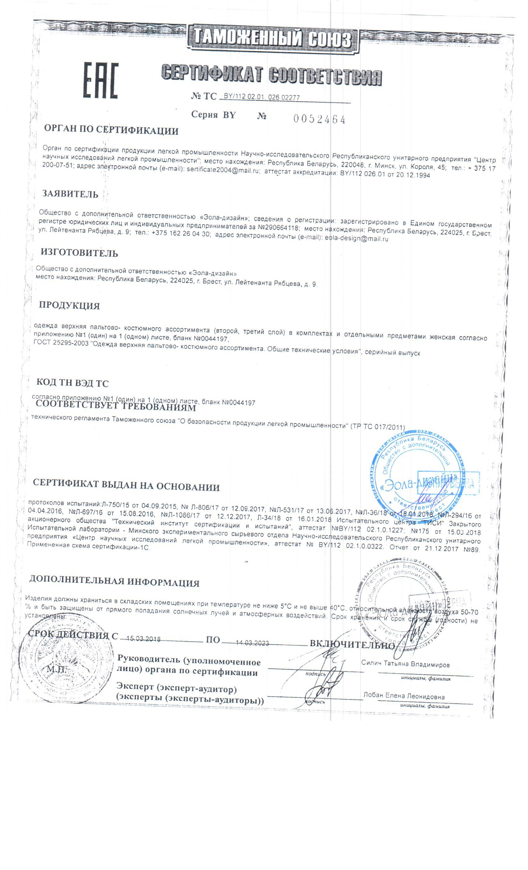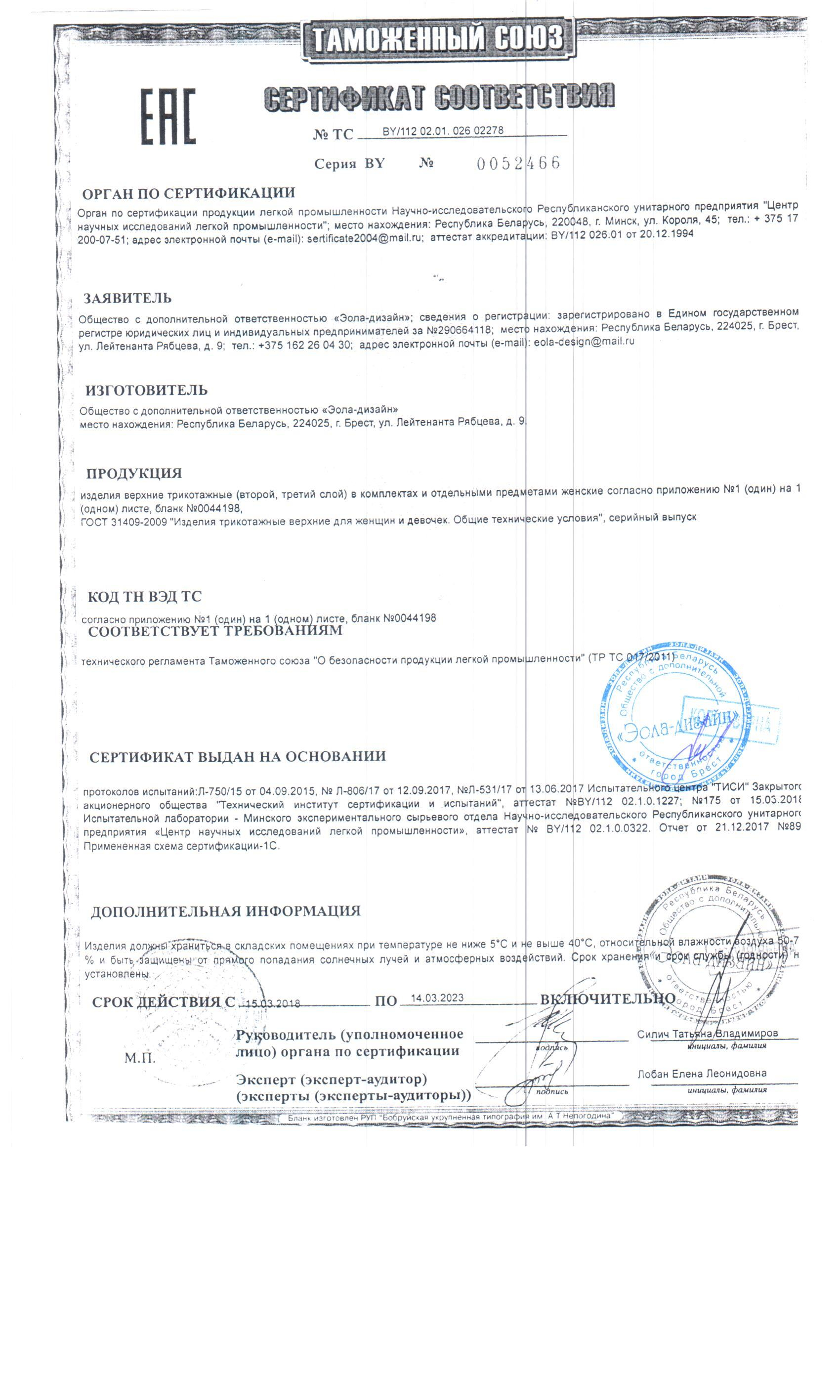 Качество одежды, представленной на сайте, подтверждено Декларацией соответствия Таможенного союза. Этот документ даёт право на реализацию товара на территории России, Беларуси, Казахстана, Армении, Киргизии без дополнительных проверок внутри страны. Наличие Декларации соответствия ТС делает процесс выхода товара на рынок максимально удобным и быстрым.