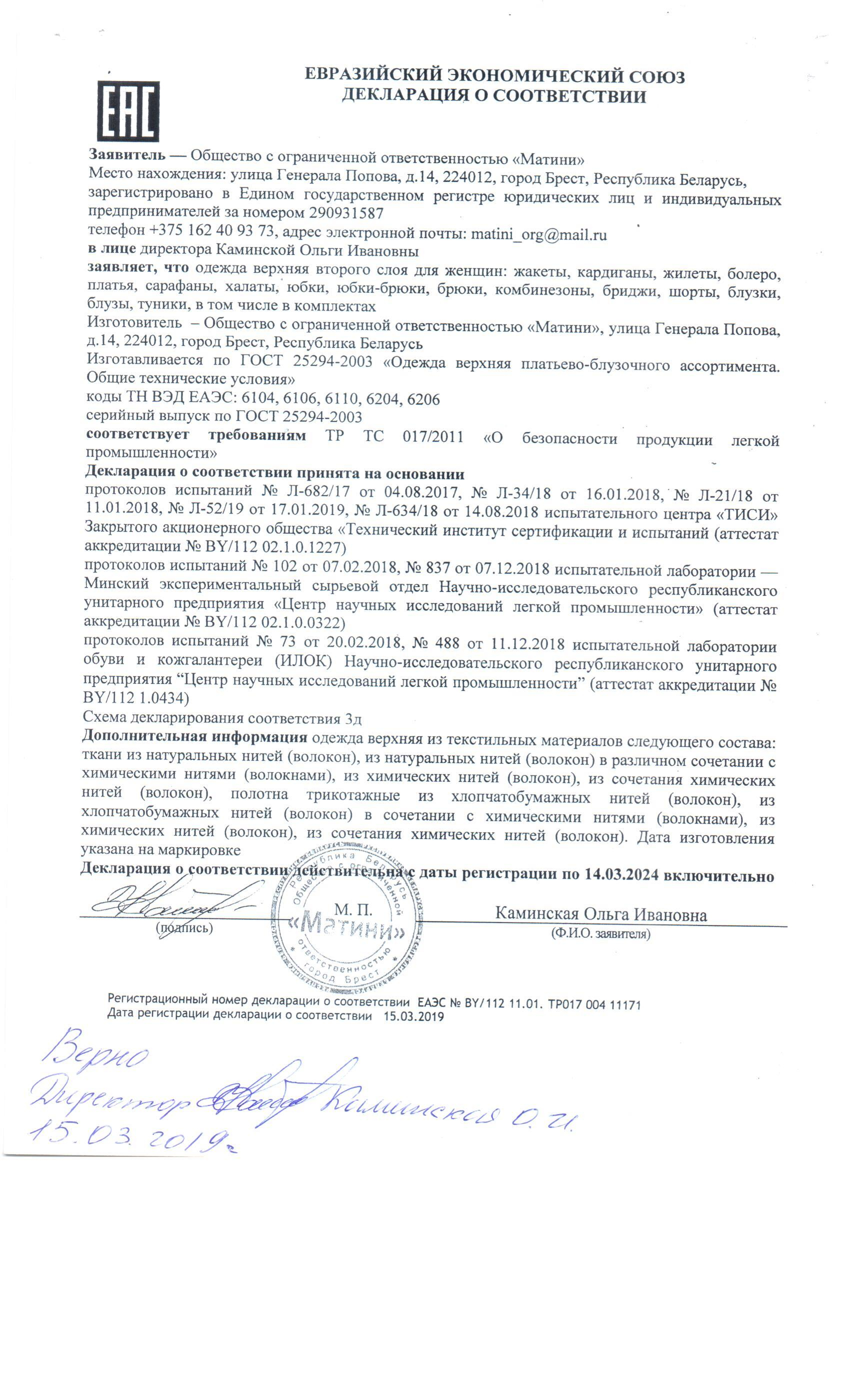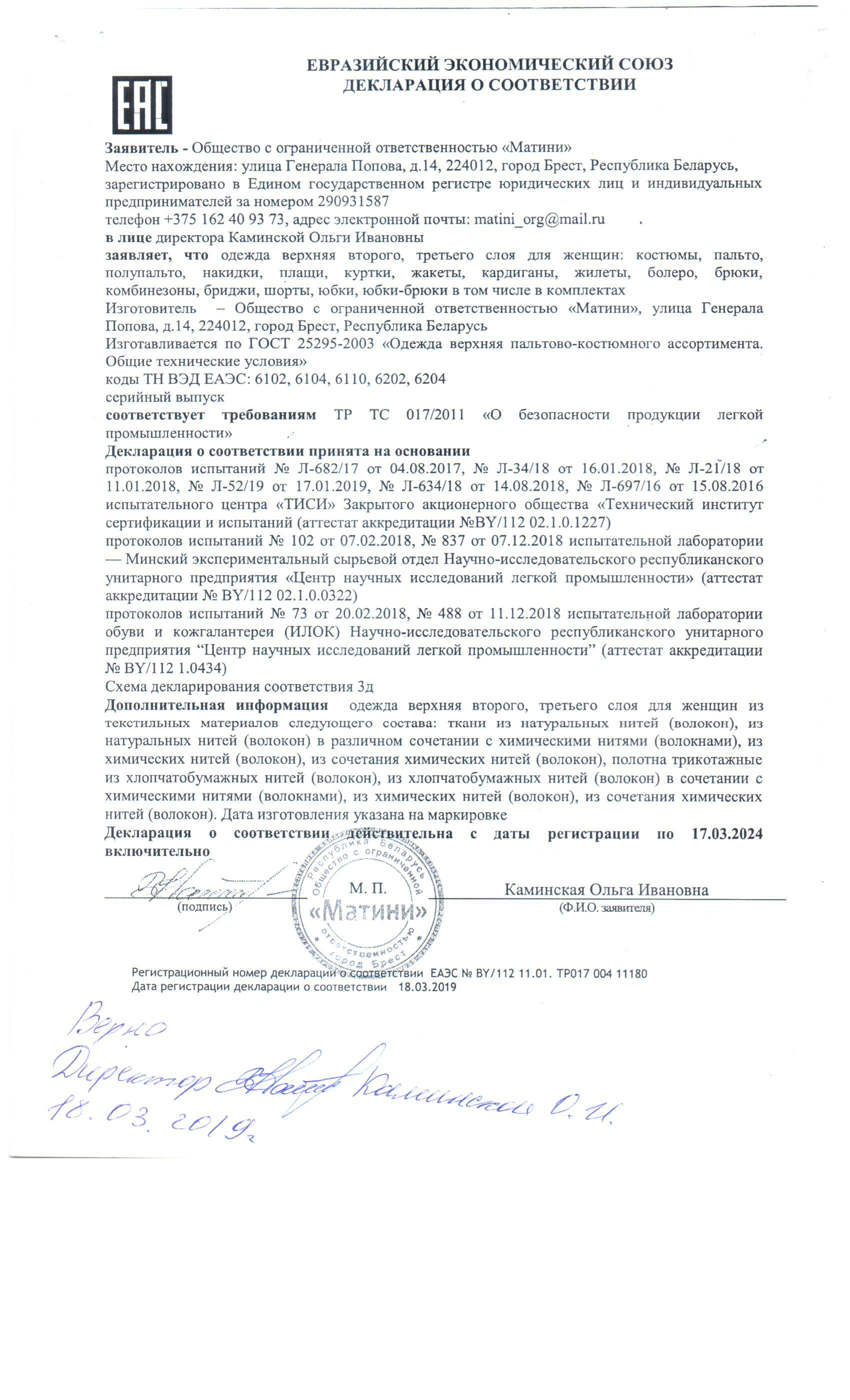 Качество одежды, представленной на сайте, подтверждено Декларацией соответствия Таможенного союза. Этот документ даёт право на реализацию товара на территории России, Беларуси, Казахстана, Армении, Киргизии без дополнительных проверок внутри страны. Наличие Декларации соответствия ТС делает процесс выхода товара на рынок максимально удобным и быстрым.