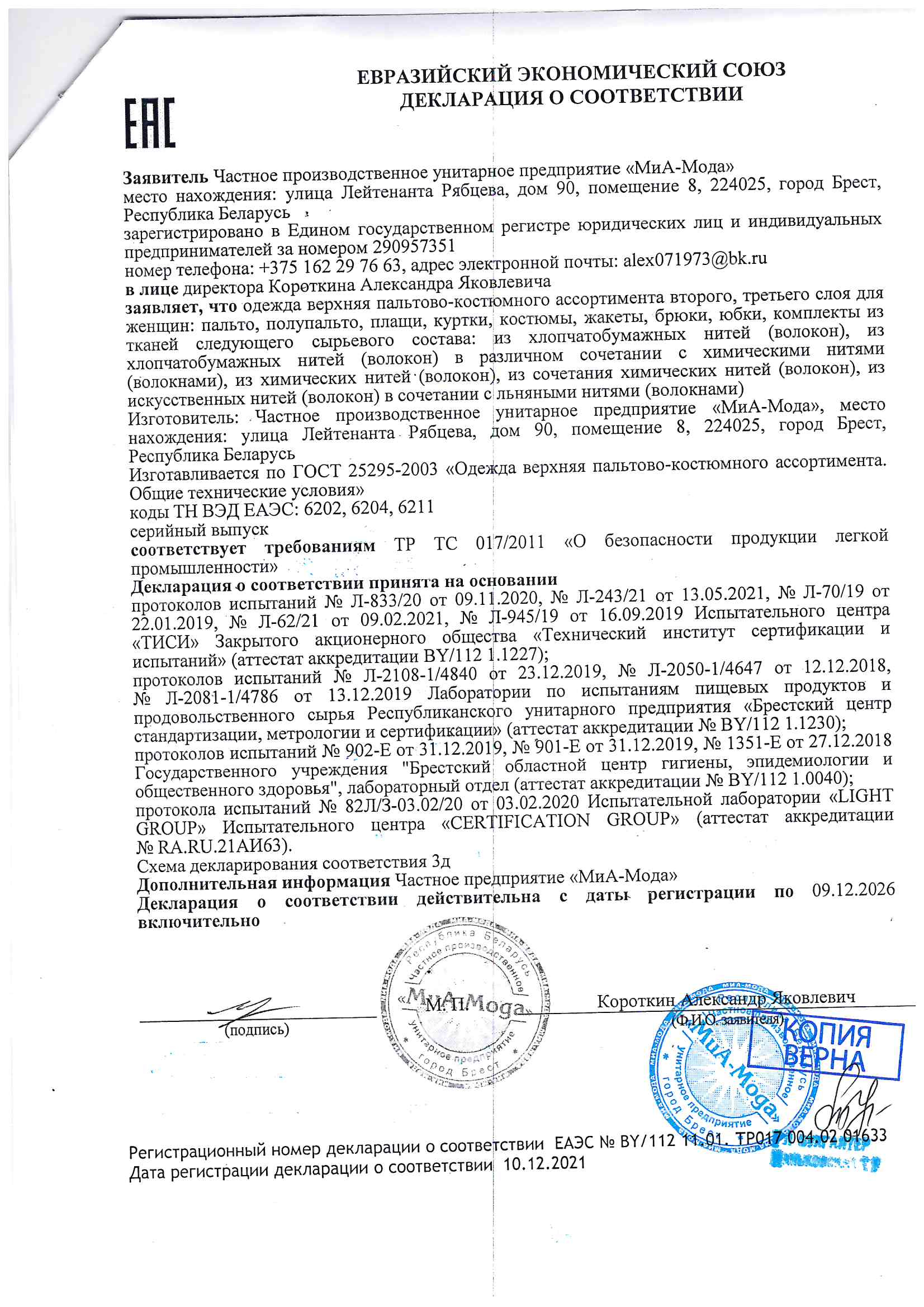 Качество одежды, представленной на сайте, подтверждено Декларацией соответствия Таможенного союза. Этот документ даёт право на реализацию товара на территории России, Беларуси, Казахстана, Армении, Киргизии без дополнительных проверок внутри страны. Наличие Декларации соответствия ТС делает процесс выхода товара на рынок максимально удобным и быстрым.