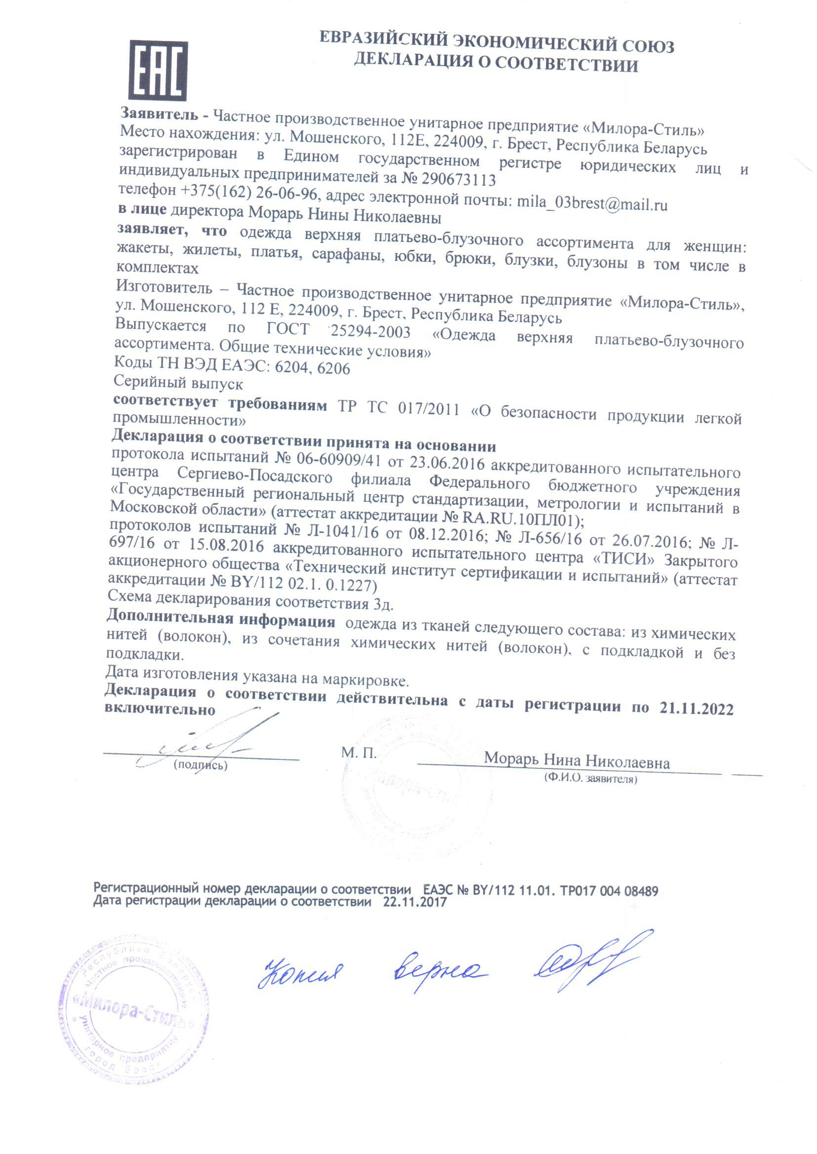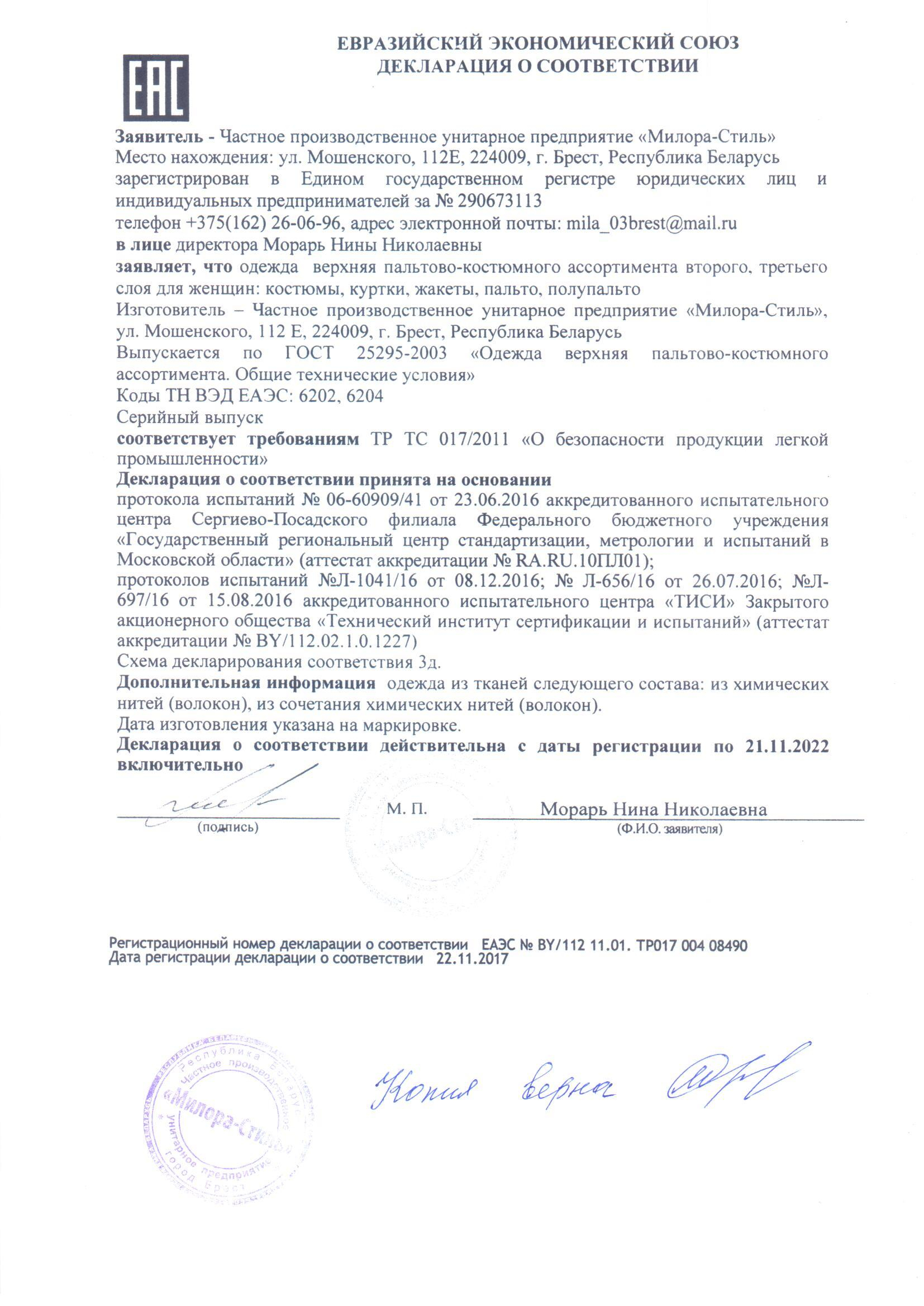 Качество одежды, представленной на сайте, подтверждено Декларацией соответствия Таможенного союза. Этот документ даёт право на реализацию товара на территории России, Беларуси, Казахстана, Армении, Киргизии без дополнительных проверок внутри страны. Наличие Декларации соответствия ТС делает процесс выхода товара на рынок максимально удобным и быстрым.