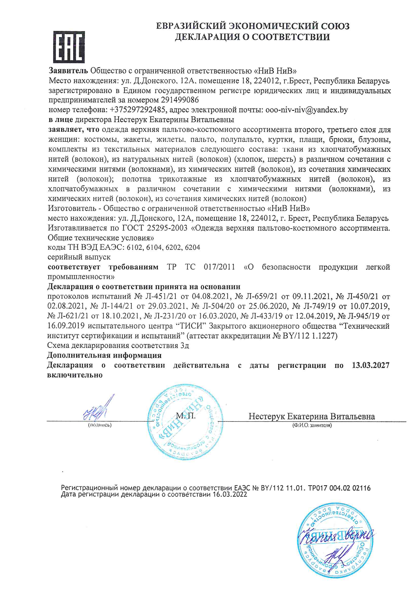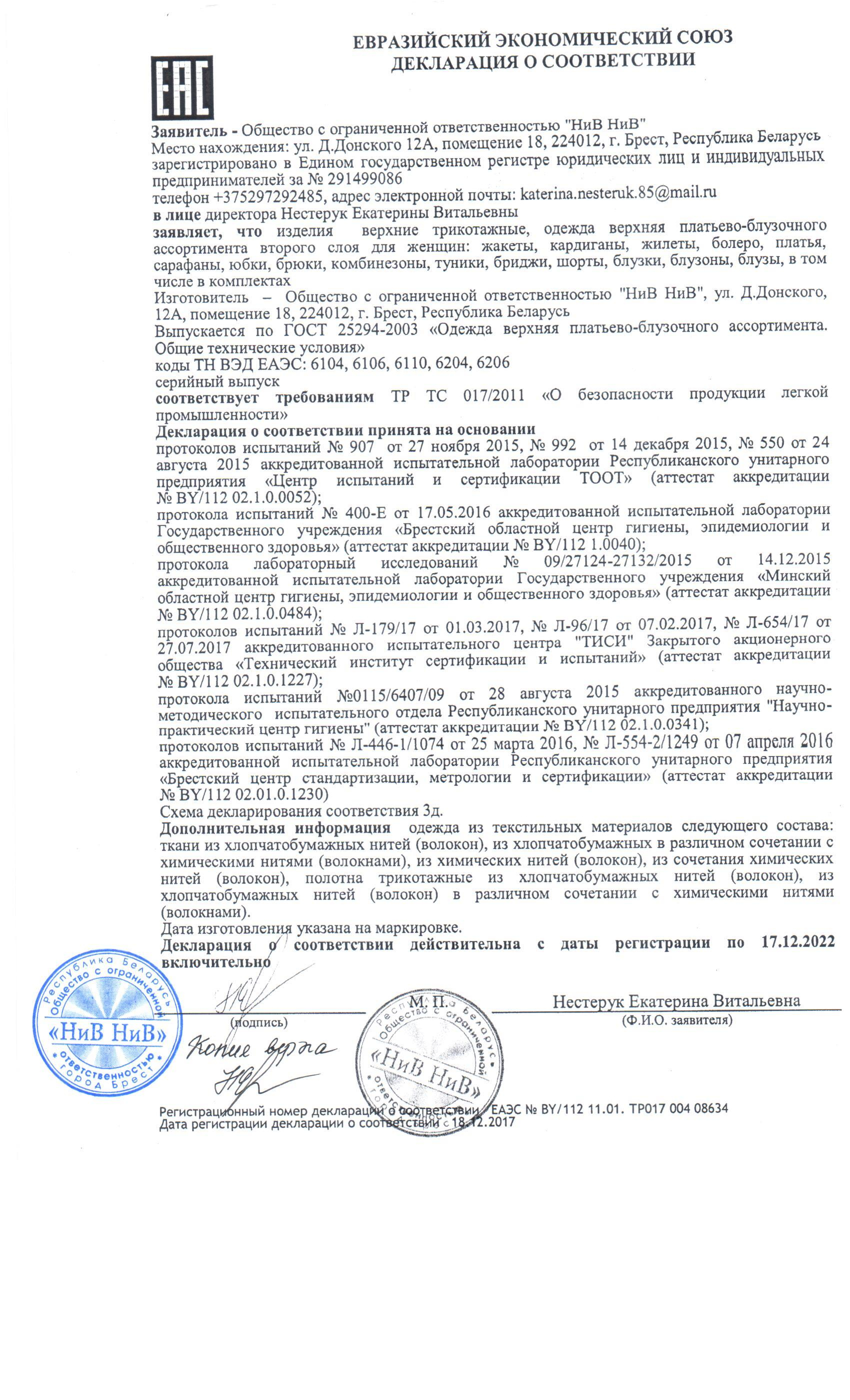 Качество одежды, представленной на сайте, подтверждено Декларацией соответствия Таможенного союза. Этот документ даёт право на реализацию товара на территории России, Беларуси, Казахстана, Армении, Киргизии без дополнительных проверок внутри страны. Наличие Декларации соответствия ТС делает процесс выхода товара на рынок максимально удобным и быстрым.
