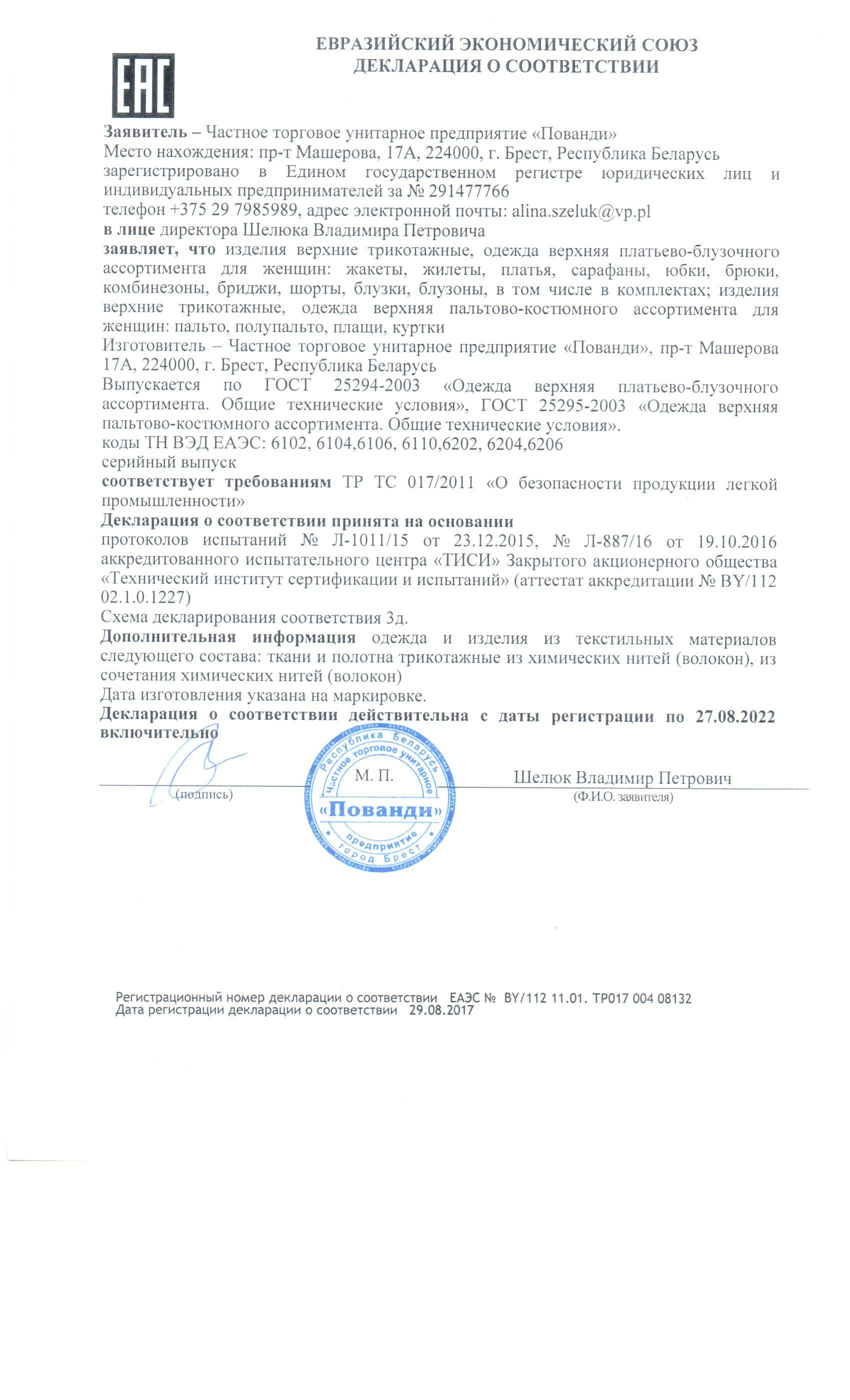 Качество одежды, представленной на сайте, подтверждено Декларацией соответствия Таможенного союза. Этот документ даёт право на реализацию товара на территории России, Беларуси, Казахстана, Армении, Киргизии без дополнительных проверок внутри страны. Наличие Декларации соответствия ТС делает процесс выхода товара на рынок максимально удобным и быстрым.