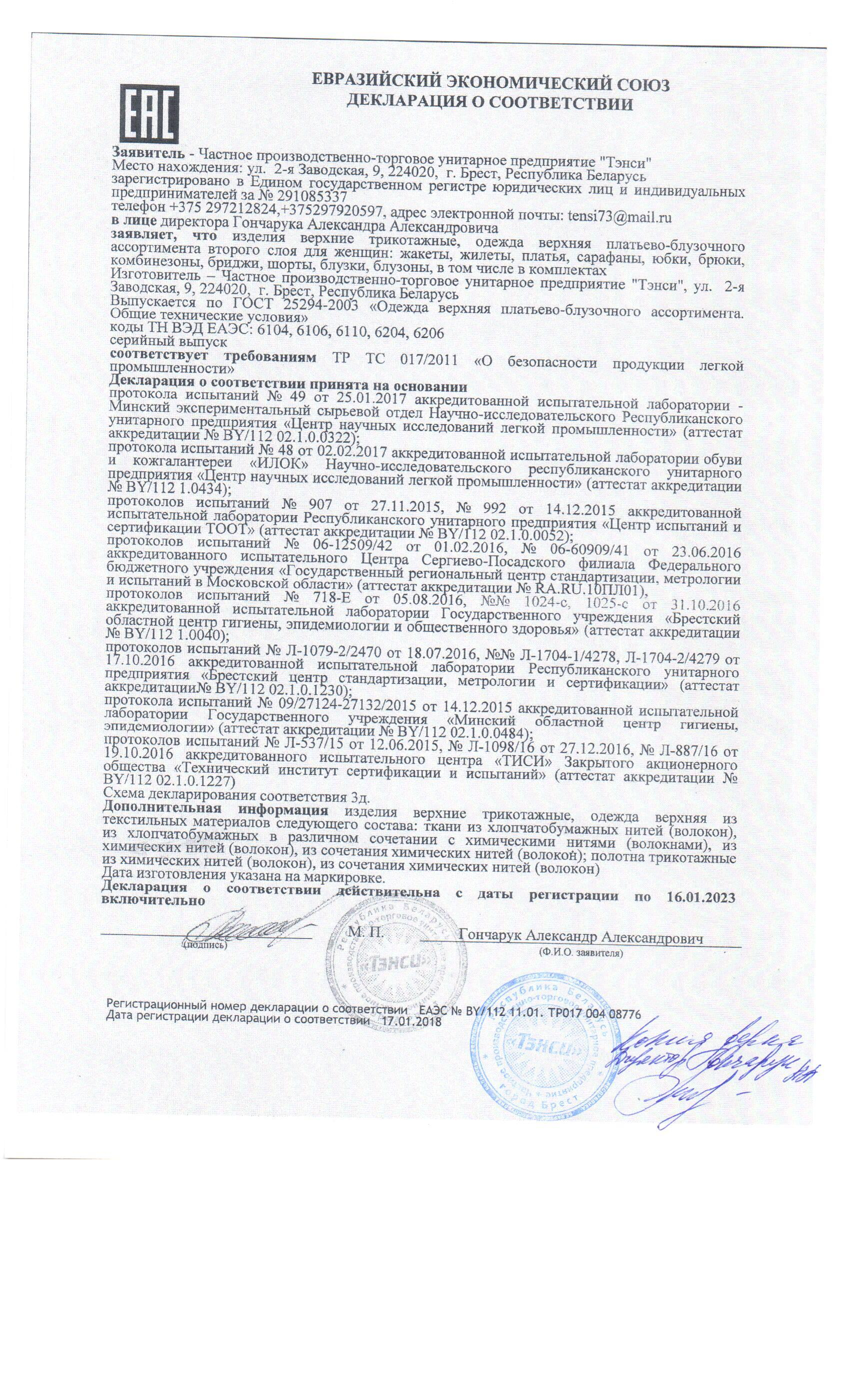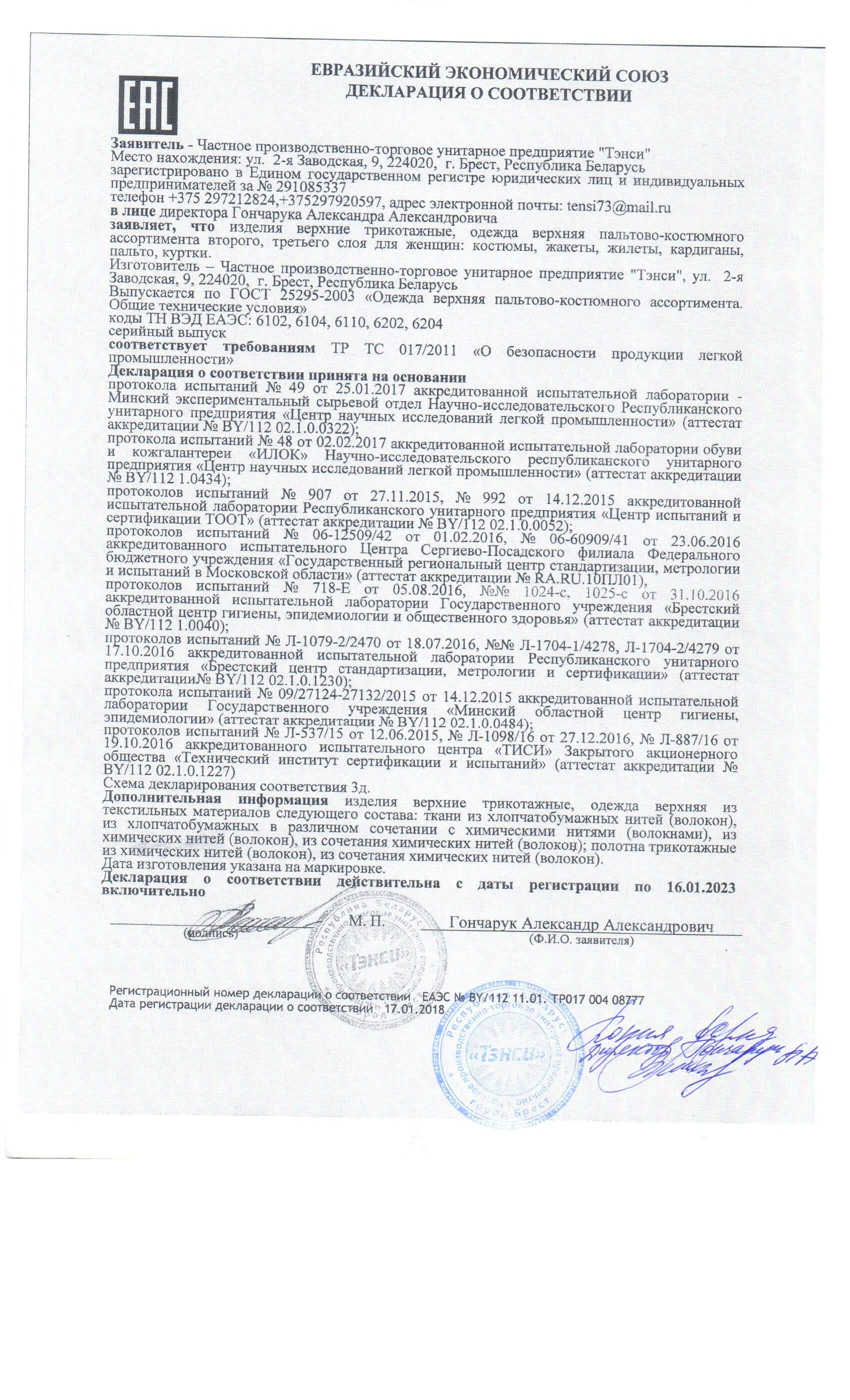Качество одежды, представленной на сайте, подтверждено Декларацией соответствия Таможенного союза. Этот документ даёт право на реализацию товара на территории России, Беларуси, Казахстана, Армении, Киргизии без дополнительных проверок внутри страны. Наличие Декларации соответствия ТС делает процесс выхода товара на рынок максимально удобным и быстрым.