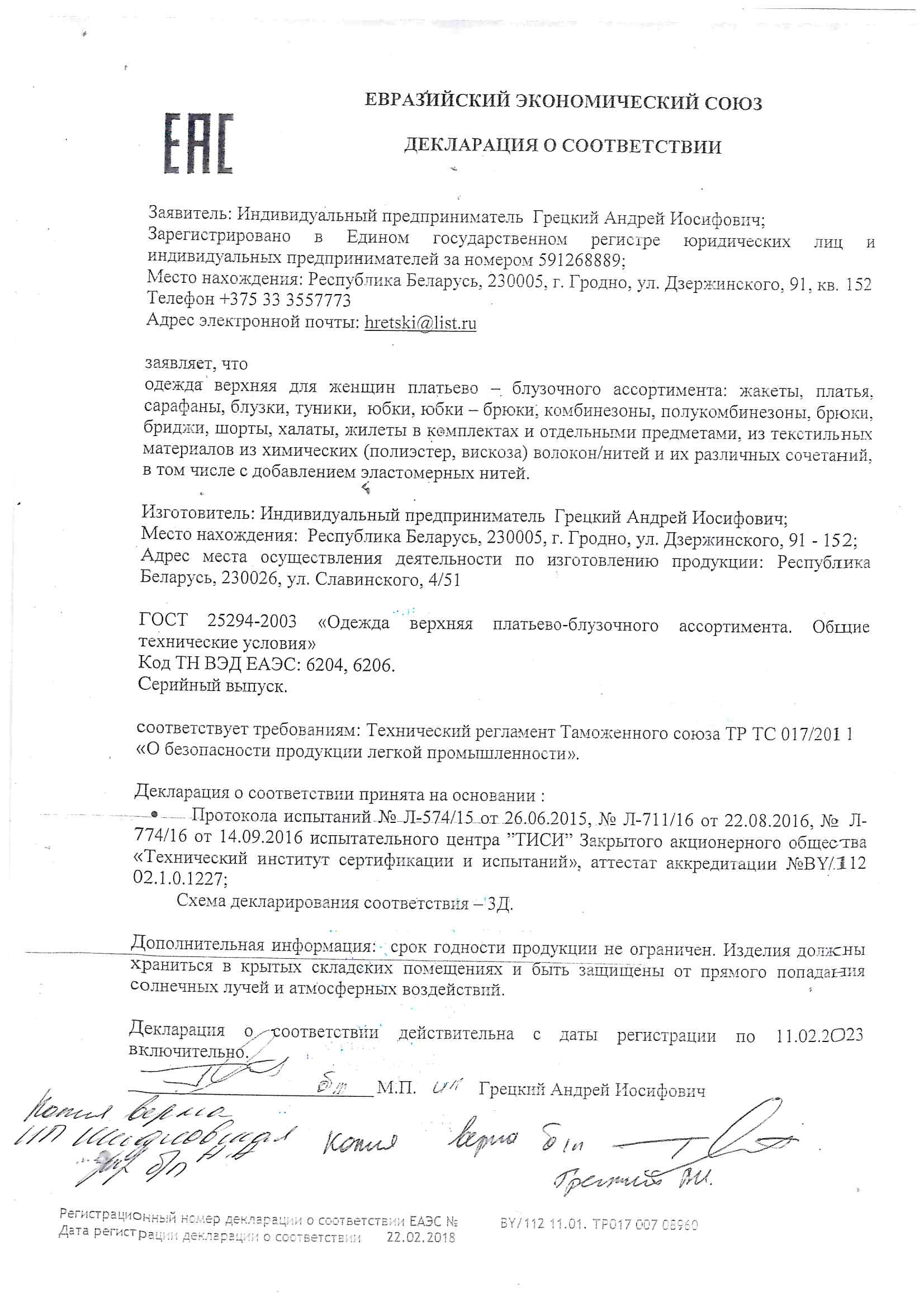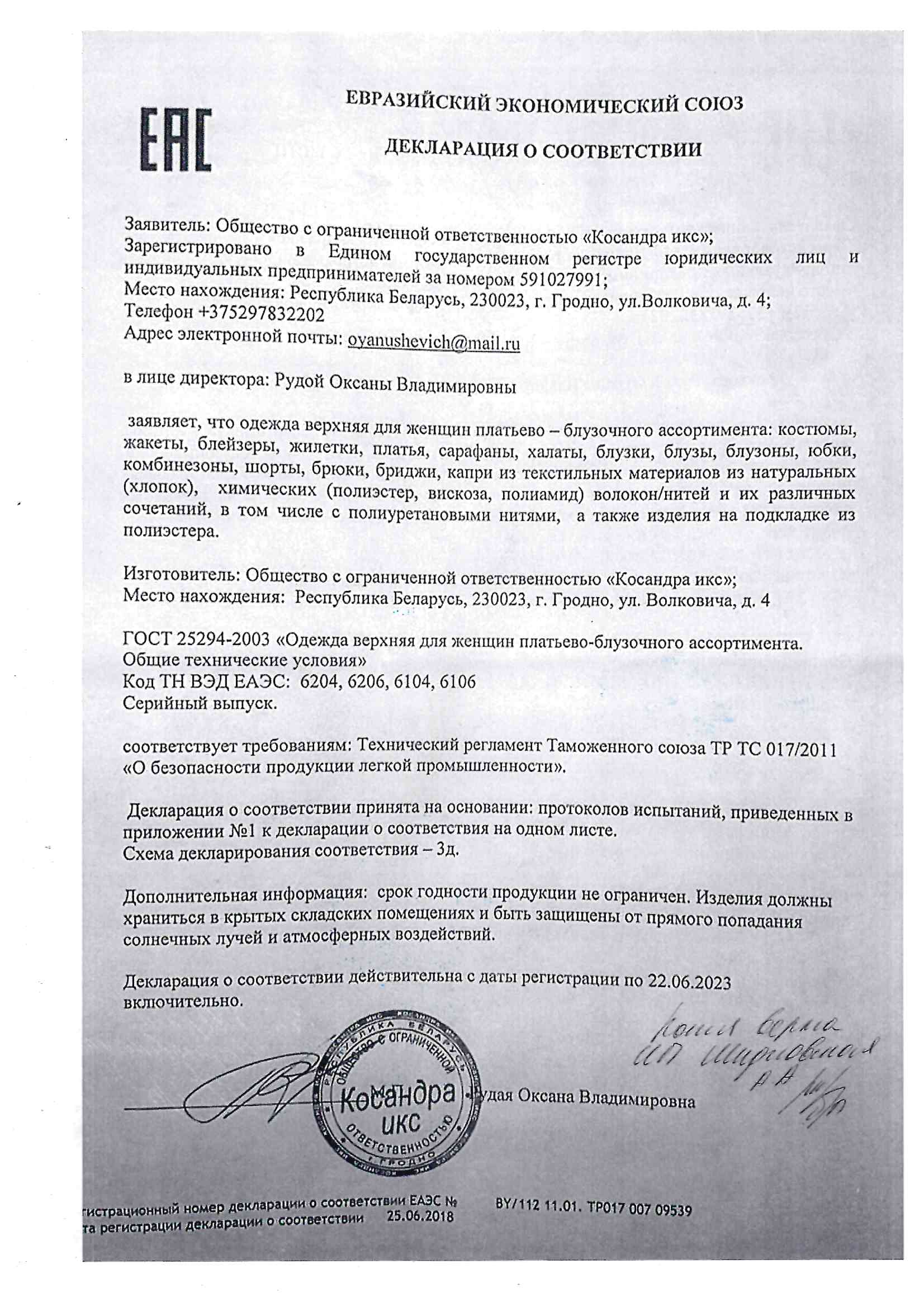Качество одежды, представленной на сайте, подтверждено Декларацией соответствия Таможенного союза. Этот документ даёт право на реализацию товара на территории России, Беларуси, Казахстана, Армении, Киргизии без дополнительных проверок внутри страны. Наличие Декларации соответствия ТС делает процесс выхода товара на рынок максимально удобным и быстрым.
