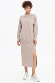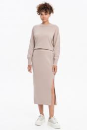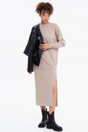 Трикотажная юбка связана из качественной пряжи 100 % шерсть меринос. Мягкая и плотная фактура не колется и приятна на ощупь. Прямой, современный, удлиненный силуэт со смещенным разрезом по коленку, юбка на эластичном поясе, без подкладки. Юбка сочетается в ансамбле и по цвету с джемпером мод.10458. Предлагается большой размерный ряд в смежных диапазонах с 44 по 58 размер. Длина юбки с поясом 83 см в зависимости от размера. Рекомендуется химчистка, а также возможна ручная стирка 30 градусов или машинная в режиме Деликатная \ Шерсть.