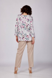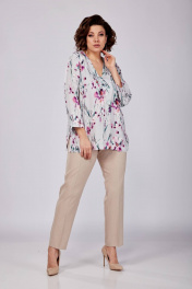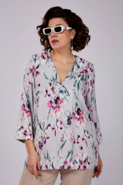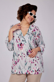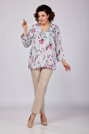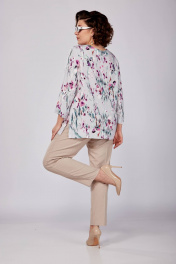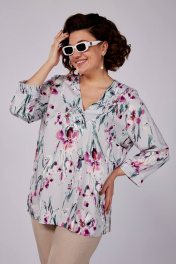 Блузка женская полуприлегающего силуэта, с втачными одношовными рукавами. По низу рукавов притачные манжеты. Перед с нагрудными вытачками, выходящими из бокового шва. Вырез горловины V-образный, с притачными широкими планками. Спинка с потайной застежкой-молнией в среднем шве. По низу боковых швов оформлены разрезы. С плечевыми накладками. Рост модели 173 см. Длина спинки по среднему шву в 50 р. – 67 см. Длина рукава – 52 см. Ширина рукава на уровне груди (полуобхват) – 22 см. Полуобхват проймы– 32 см