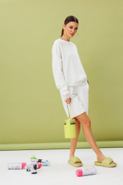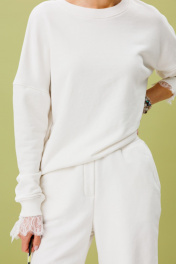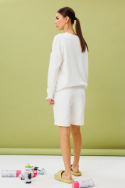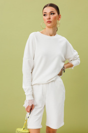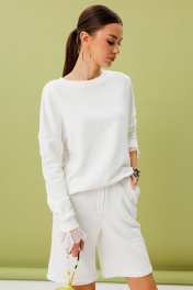 Костюм джемпер+шорты. Джемпер свободного силуэта со спущенной линией плеча,манжета-кашкарсе держит форму, украшено кружевом. Шорты прямые на подвороте к низу, пояс на резинке. Карманы в боковых швах. Ткань футер (трехнитка), средней плотности. Премиальное качество.