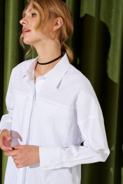 Женская оверсайз рубашка. Из высококачественного хлопкого материала. Детали: свободный покрой, прямой силуэт, спущенная линия плеча, отрезная кокетка, накладные карманы, фигурные разрезы по низу боковых швов, застежка на петли и пуговицы-потайная, рукава длинные с манжетами.