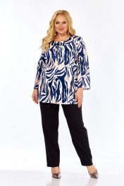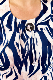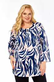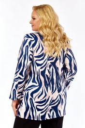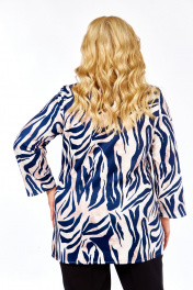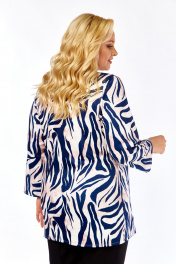 Блузка с современным модным принтом «Зебра» в сине-кремовых тонах, с размерами от 54-го до 64-го. Блузка украшена современным модным принтом «Зебра» в огненной сине-кремовой гамме. Плавные линии выглядят стильно, но не вызывающе — идеально для женщин, которые ценят хороший вкус. Принт не выгорает, не линит и отлично сочетается с однотонными юбками, брюками и джинсами. Адаптация для офиса, прогулок и встреч с подругами. Блузка с описанным принтом — современная интерпретация лёгкого бохо в ключе smart-casual. Утончённый акварельный принт в синих, белых и кремовых тонах освежает образ, не перегружая силуэт. А материал – итальянский трикотаж (50% вискоза / 50% полиэстер) — эластичный, достаточно плотный, но лёгкий и дышащий. Ткань хорошо драпируется, сохраняет форму и имеет деликатный отблеск. Крой и посадка: свободный прямой силуэт, напоминающий тунику; длинные рукава, край рукава достигает запястья (на модели рост 170 см, размер модели 58). Блуза с с мягкими поролоновыми подплечниками – стройнит фигуру. Центральные передние вертикальные вытачки (две симметричные складки по центру) — конструктивный элемент, формирующий объём и посадку в области груди и талии, особенно важный для моделей без традиционных нагрудных вытачек. Круглый вырез украшен декоративной пуговицей и декоративными завязками — они служат эстетическим акцентом, а не функциональной шнуровкой. Размеры: от 54 до 64. Фотомодель на фото: 58 размер фигуры, рост 170 см — пример посадки на фигуру указанного диапазона. Комбинации: отлично смотрится с классическими брюками, джинсами, юбками и шортами. Подходит для офиса, прогулок и вечерних встреч. Почему стоит внимания: итальянский трикотаж обеспечивает комфорт и аккуратную посадку, а центральные передние вытачки делают силуэт более изящным — даже при свободном крое. Эта блузка — выбор уверенных женщин, которые ценят стиль и удобство. Характеристики блузки: Размерны: 54, 56, 58, 60, 62, 64 (54-64). Состав ткани: Вискоза 50%, Полиэстер 50% Материал: Эластичный ""итальянский трикотаж «масло»"" Свойства ткани: Дышащая, легкая, отлично драпируется, практически не мнется, сохраняет яркость принта. Уход: рекомендуется деликатная стирка при температуре не выше 30 градусов. Ориентир по посадке (на фотомодели): Рост модели: 170 см Размер блузки на фотомодели: 58 Размер блузки на фотомодели: 58 Обратите Внимание: ткань эластична и хорошо тянется. Для максимально точного выбора размера ознакомьтесь с Таблицей Замеров Готовых Изделий, которая представлена среди фотографий товара (слайд с таблицей). Сравните параметры блузки с вашей одеждой.