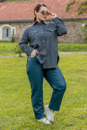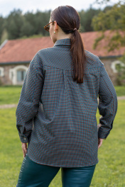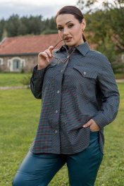 Рубашка из мягкой ткани прямого силуэта с центральной бортовой застёжкой на петли и пуговицы, воронитк стояче-отложной, полочка с нагрудыми накладными карманами застёгивающиеся на петлю и пуговицу. Спинка с отрезной фигурной кокеткой, со складкой по центру. низ фигурный. рукава втачные двухшовные с притачной манжетоЙ застёгивающейся на петли и пуговицы.