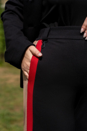 Костюм женский брючный состоящий из жакет на подкладке и брюк. Соременный жакет на подкладке из премиум трикотажа, с центральной бортовой застёжкой на петли и пуговицы. Горловина круглой формы. рукава притачные с отложными манжетами. На полочке в горизонтальном подрезе обработаны карманы. По низу спинки обработана кулиса с эластичной резинкой,сосредним швом. Брюки женские прямого кроя, на притачном поясе по переду и с резинкой по спинке. Передние половинки с карманами в швах. Брюки по боковым швам со вставкой из конрастной ткани. По передней вставке пояса обработа ны шлёвки и декоративная подвеска.