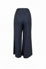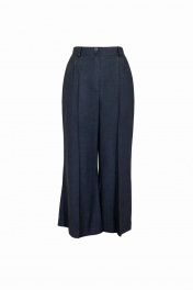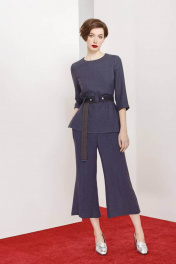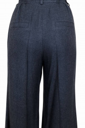 Брюки женские из костюмно-плательной ткани, расширенные к низу, на притачном поясе. Застежка брюк в верхней части среднего шва передних частей на тесьму-молнию, петлю и пуговицу по концам пояса. Пояс с эластичной тесьмой, пятью шлевками. Передние части брюк с боковыми карманами, обработанными в швах отрезных бочков, односторонними складками, заутюженными кантами. Задние части брюк с прорезными карманами с листочкой с втачными концами, заутюженными кантами.
