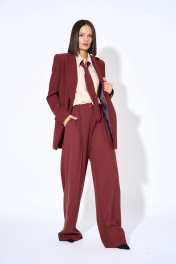 Жакет из костюмно-плательной ткани, прямого силуэта, со смещенной бортовой застежкой на две петли и пуговицы. На правой части переда соответственно расположению петель пришиты отделочные пуговицы. Петля левой части переда застегивается на пуговицу, пришитую со стороны подборта правой части переда. Перед с нагрудными вытачками из бокового шва, прорезными карманами с клапаном и двумя обтачками. Спинка со средним швом, плечевыми вытачками, средний шов заканчиваются открытой шлицей. Рукава втачные, двухшовные, длинные. Воротник отложной с отворотами из подбортов. Жакет на подкладке с плечевыми накладками.