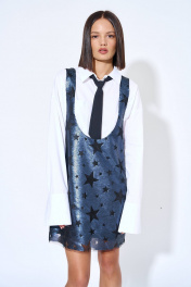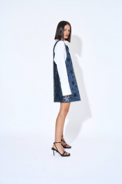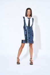 Платье женское, из плательной ткани, прямого силуэта, с застежкой на потайную тесьму-молнию, расположенную в боковом шве. Перед и спинка с углубленной круглой горловиной. Платье без рукавов, на подкладке.