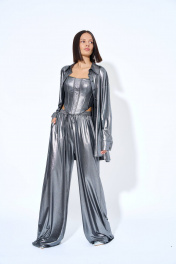 Брюки женские из трикотажного полотна. С притачным поясом, пояс с эластичной тесьмой, двумя обметанными петлями, в петли вставлен шнур (из окантовки). Передние части брюк с боковыми карманами, обработанными в швах отрезных бочков.