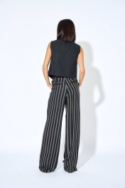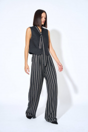 Брюки женские из костюмно-плательной ткани, прямые, на притачном поясе. Застежка брюк в верхней части среднего шва передних частей на тесьму-молнию, петлю и пуговицу по концам пояса. Передние части брюк с боковыми карманами, обработанными в швах отрезных бочков, заутюженными кантами, с односторонними складками, сгиб которых направлен к боковому шву. Задние части брюк с заутюженными кантами, талевыми вытачками, прорезными карманами с листочкой с втачными концами.
