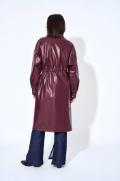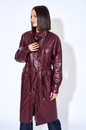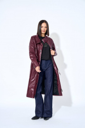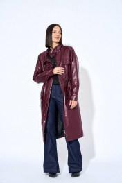 Плащ женский, из искусственной кожи, прямого силуэта, с застежкой на разъемную тесьму молнию, с настроченной планкой на правой части переда, планка с застежкой на шесть металлических кнопок. Перед цекльновыкроен с передними частями рукавов, с отрезной кокеткой в шов притачивания кокетки вставлен клапан, с накладными карманами с клапаном, клапаны с застежкой на две кнопки. Спинка цельновыкроенная с локтевыми частями рукавов, с отрезной кокеткой. Перед и спинка с настроченной кулисой в кулису продет шнур, шнур продет в фиксатор с наконечниками. Рукава цельновыкроенные, одношовные, длинные, с отрезной нижней частью рукава, в шве обработан разрез, с притачными манжетами, манжеты с застежкой на две кнопки. Воротник стойка, с застежкой на две кнопки. Плащ на утепленной подкладке.
