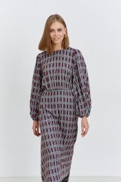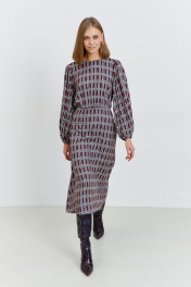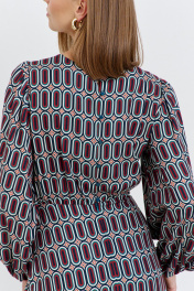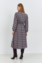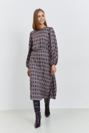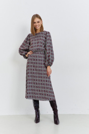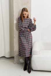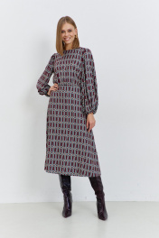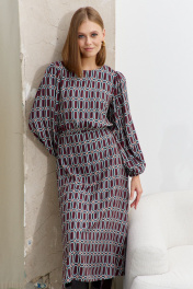 Платье женское, из плательной ткани, полуприлегающего силуэта, отрезное по линии талии, с застежкой, расположенной в среднем шве спинки, на семь навесных петель и пуговиц, потайную молнию. Верхняя часть переда и спинки присборена. Нижняя часть переда и спинки, расширенная к низу. Рукава длинные, окат и низ рукава присборен, с узкими притачными манжетами, в манжеты продета эластичная тесьма. Горловина переда и спинки круглая.