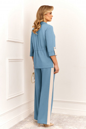 Стильный комплект, состоит из жакета и брюк. Жакет прямого силуэта, выполнен из высококачественной ткани Диагональ с добавлением вискозы. Жакет без подкладки, по переду с застежкой на 3 пуговицы и завязкой кулисой, что дает возможность придать жакету приталенность или наоборот свободность. Рукав жакета втачной, длиной 3/4, с манжетой и патой с застежкой на две пуговицы. По боккам жакет со вставкой из осной ткани светлого цвета и разрезами, что придает модели особый стиль и шарм. Брюки прямые, выполнены из высококачественной ткани Диагональ с добавлением вискозы, на поясе, по переду с застежкой на пуговицу и молнию, по спинке с резинкой. По бокам брюки со вставкой из осной ткани светлого цвета (имитация лампаса), что придает модели особый стиль и шарм. В боковых швах функциональные карманы.