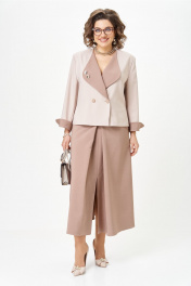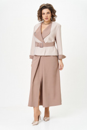 Женственный костюм в мягкой нюдово-бежевой гамме воплощает элегантную сдержанность и современную классику. Образ построен на тонкой игре оттенков: светлый жакет гармонично сочетается с юбкой более насыщенного пудрово-карамельного цвета, создавая цельный и благородный ансамбль. Жакет с глубоким запахом и акцентным воротником формирует выразительную линию декольте и подчёркивает зону плеч. Пояс с декоративной пряжкой мягко акцентирует талию, придавая силуэту стройность и женственность. Контрастная отделка воротника, манжет и пояса добавляет модели графичности и визуальной глубины. Юбка миди свободного силуэта с центральной складкой и разрезом обеспечивает элегантность движений и визуально вытягивает фигуру. Лаконичный крой подчёркивает статусность образа, сохраняя при этом комфорт и универсальность.