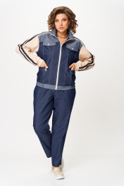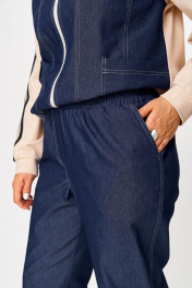 Тренд сезона, брючный джинсовый костюм с трикотажными вставками. Бомбер прямого силуэта на спущенной пройме. По переду кокетка, накладные карманы и контрастные отстрочки. Застежка центральная на молнию. Воротник стойка. Спинка и рукава трикотажные, по спинке кокетка. Рукав декорирован кантом, по низу манжета. Брюки, слегка зауженные к низу, свободного силуэта. По переду вблизи боковых швов карманы. Для максимально комфортной посадки по поясу вставлена эластичная резинка.