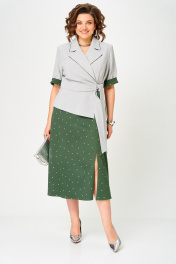 Женское платье выполнено в элегантном повседневно-деловом стиле с элементами романтики. Модель отличается оригинальным сочетанием тканей и продуманным кроем, создающим выразительный и современный силуэт. Верхняя часть платья выполнена из однотонной ткани светлого оттенка и имитирует жакет с запахом, что придаёт образу строгость и утончённость. Отложной воротник с лацканами усиливает классический характер изделия. Акцентом модели является пояс-завязка по линии талии, формирующий женственный силуэт и подчёркивающий фигуру. Нижняя часть платья выполнена из контрастной ткани зелёного цвета с мелким гороховым рисунком, что добавляет образу лёгкости и динамичности. Юбка имеет мягкое расклешение и разрез спереди, обеспечивающий удобство движения и придающий образу изящность. Короткие рукава с контрастными отворотами гармонично дополняют композицию изделия. Платье выглядит стильно и универсально.