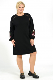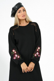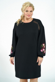 Платье женское прямого силуэта, со спученной линией плеча, рукава понизу декорированы вышивкой. Перед с притачными каскетками в шве соединения с отделочной тесьмой «кружево». Горловина с втачной бейкой. Рукава длинные, одношовные, понизу с притачными манжетами. Бейка горловины, манжеты рукава выполнены из отделочной ткани «довяз».