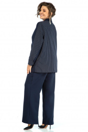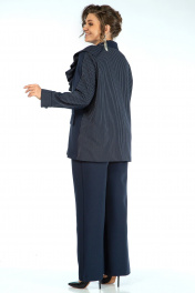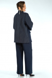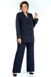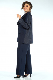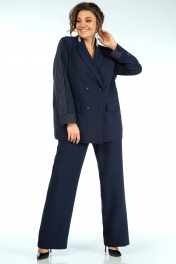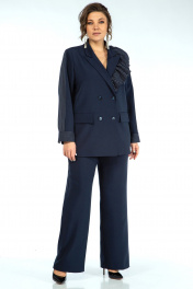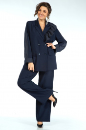Жакет прямого, свободного силуэта, с двух-бортной застёжкой на петли и пуговицы и с внутренней застёжкой на петлю и пуговицу, перед и спинка на подкладке, по левой стороне декорирован съёмной оборкой пристёгивающаяся под лацканом на пришивные кнопки. Перед с прорезными карманами с листочкой и клапаном. Рукава втачные, двушовные, длинные, понизу с разрезом в локтевом шве и притачными манжетами застёгивающиеся на навесную петлю и пуговицу. Воротник пиджачного типа. Брюки широкие, свободного прямого силуэта, на притачном поясе. Застёжка на тесьму-молнию в среднем шве переда и петлю и пуговицу по поясу. Передние части с талевой выточкой и косыми боковыми карманами. Задние части с талевой выточкой.