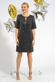 Платье силуэта А-образной формы. Перед с нагрудными выточками и с V- образным разрезом верх по горловине. Рукава втачные, одношовные, короткие. Горловина круглой формы обработана окантовочным швом.
