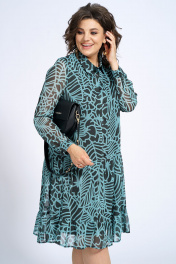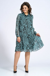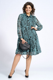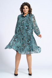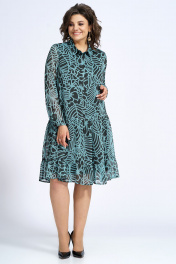 Платье женское силуэта А- образной формы, на подкладке, отрезное ниже линии талии, понизу с двумя притачными оборками разной ширины по шву соединения собраны на сборку. С застёжкой по притачной планке на петли и пуговицы. Перед с нагрудными выточками. Рукава втачные, одношовные, длинные, понизу с разрезом и притачными манжетами застёгивающиеся на петлю и пуговицу. Воротник стояче отложной на отрезной стойке, застегивающийся на петлю и пуговицу.