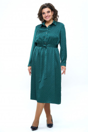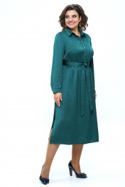 Платье женское полуприлегающего силуэта верху с расширением к низу, отрезное по линии талии, с завязывающимся поясом и в дополнении ремень. С застёжкой по планке на петли и пуговицы, по боковым разрезы. Перед с нагрудными выточками. Рукава втачные, одношовные, длинные, понизу с разрезом, двумя мягкими складками и притачными манжетами на петлю и пуговицу. Воротник стояче-отложной на отрезной стойке застёгивающийся на петлю и пуговицу.
